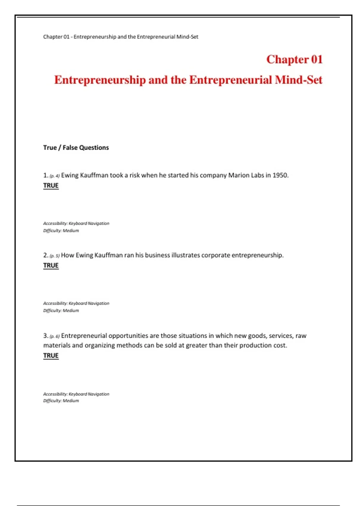 This comprehensive test bank corresponds to the latest edition of the Hisrich entrepreneurship textbook. It includes True/False questions, Multiple Choice questions, and Essay Questions—complete with answers and difficulty ratings—for chapters covering entrepreneurship fundamentals, entrepreneurial strategy, creativity, business planning, marketing, organizational structure, financial planning, and sources of capital. Ideal for students reviewing key concepts and instructors preparing exams, quizzes, and assignments.
