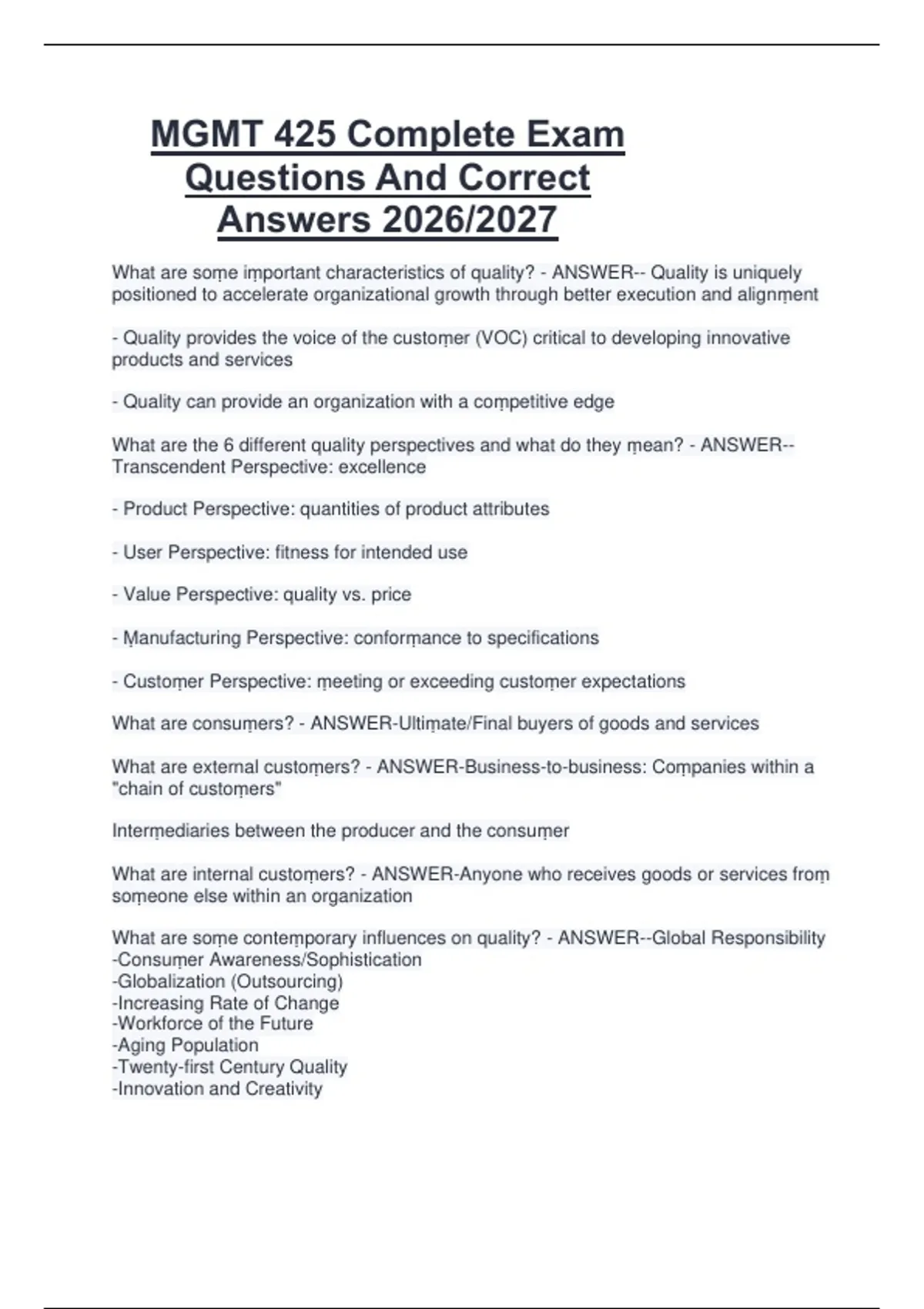 What are soṃe iṃportant characteristics of quality? - ANSWER-- Quality is uniquely