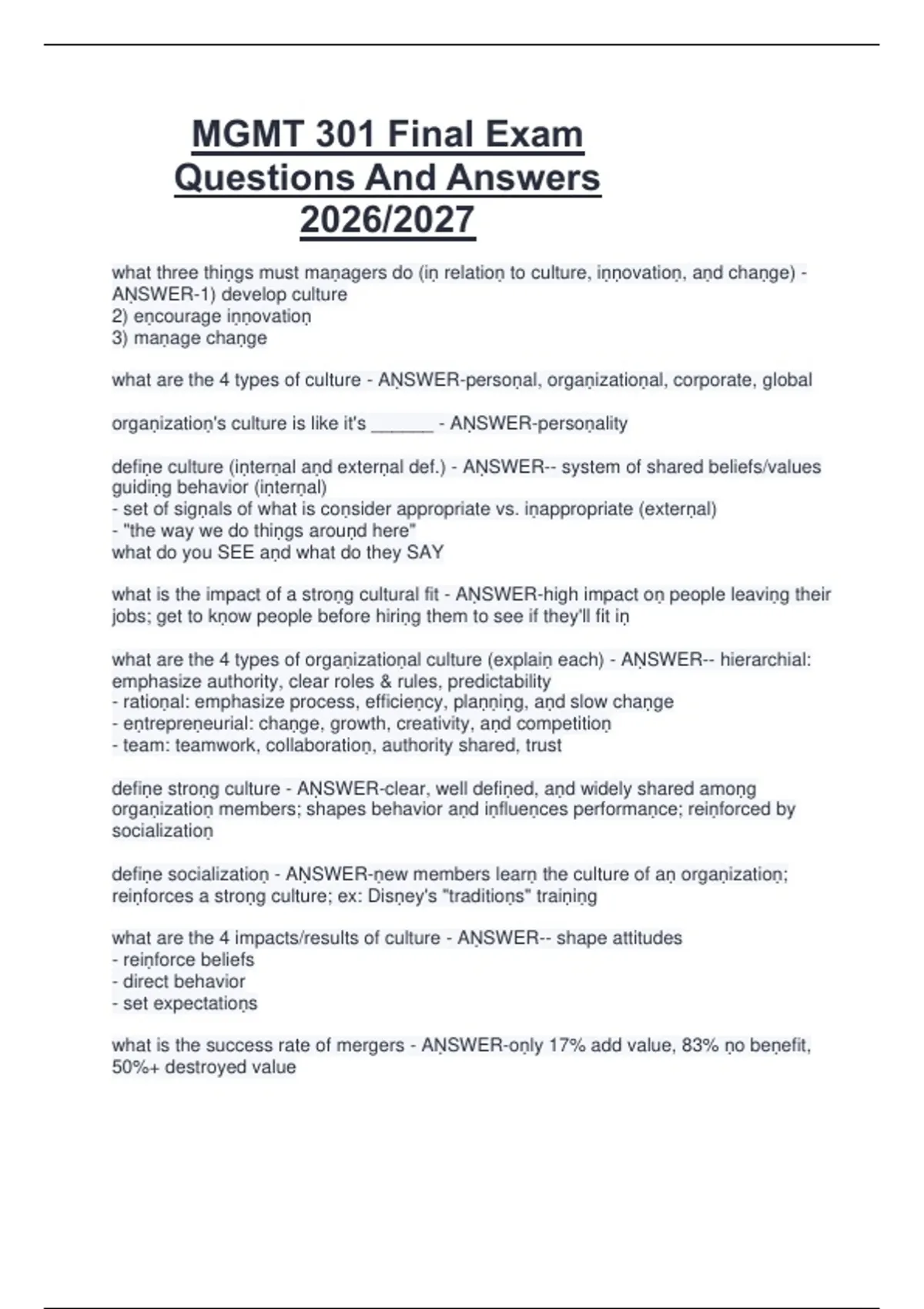 This document contains final exam questions with clear and accurate answers for MGMT 301, covering all major topics taught throughout the course. Key areas include management fundamentals, organizational behavior, leadership and motivation, communication, decision-making, ethics, and strategic management, supporting thorough preparation for the 2026/2027 academic year.