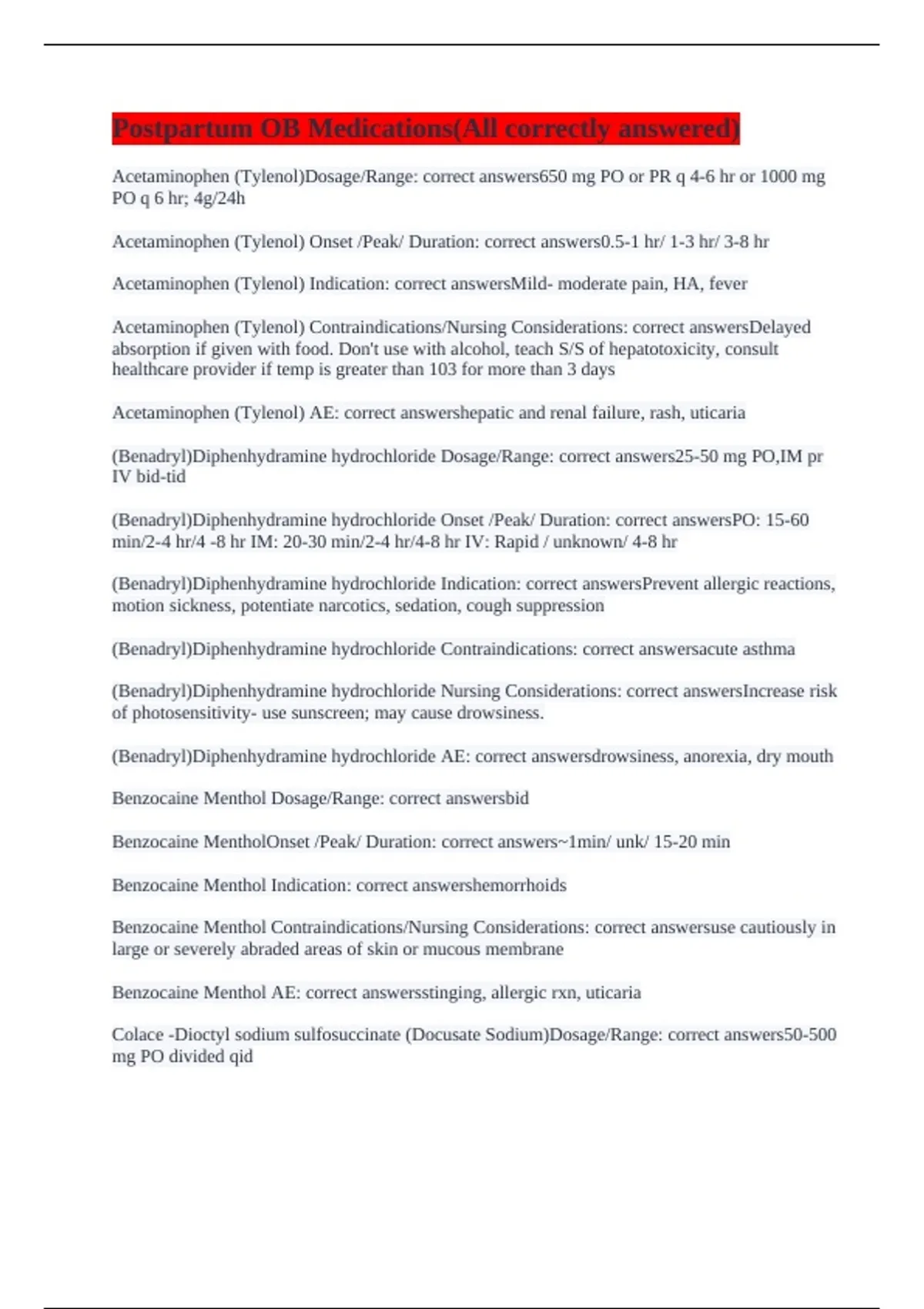 Colace -Dioctyl sodium sulfosuccinate (Docusate Sodium)Dosage/Range: correct answers50-500