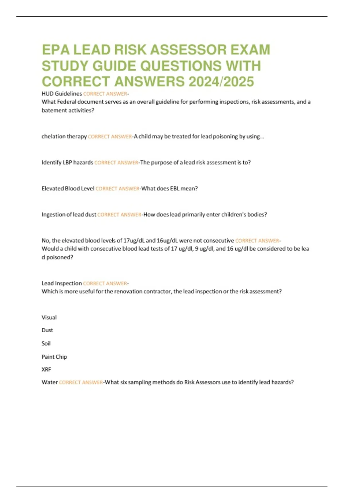 Water CORRECT ANSWER-What six sampling methods do Risk Assessors use to identify lead hazards?