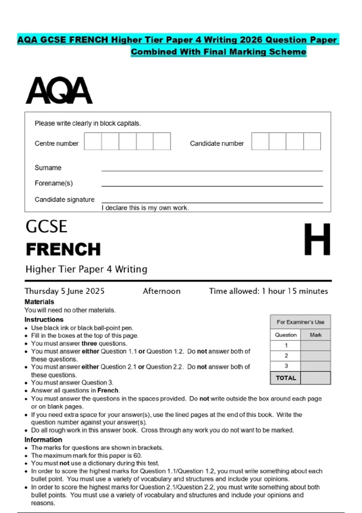 AQA GCSE FRENCH Higher Tier Paper 4 Writing 2026 Question Paper Combined With Final Marking Scheme