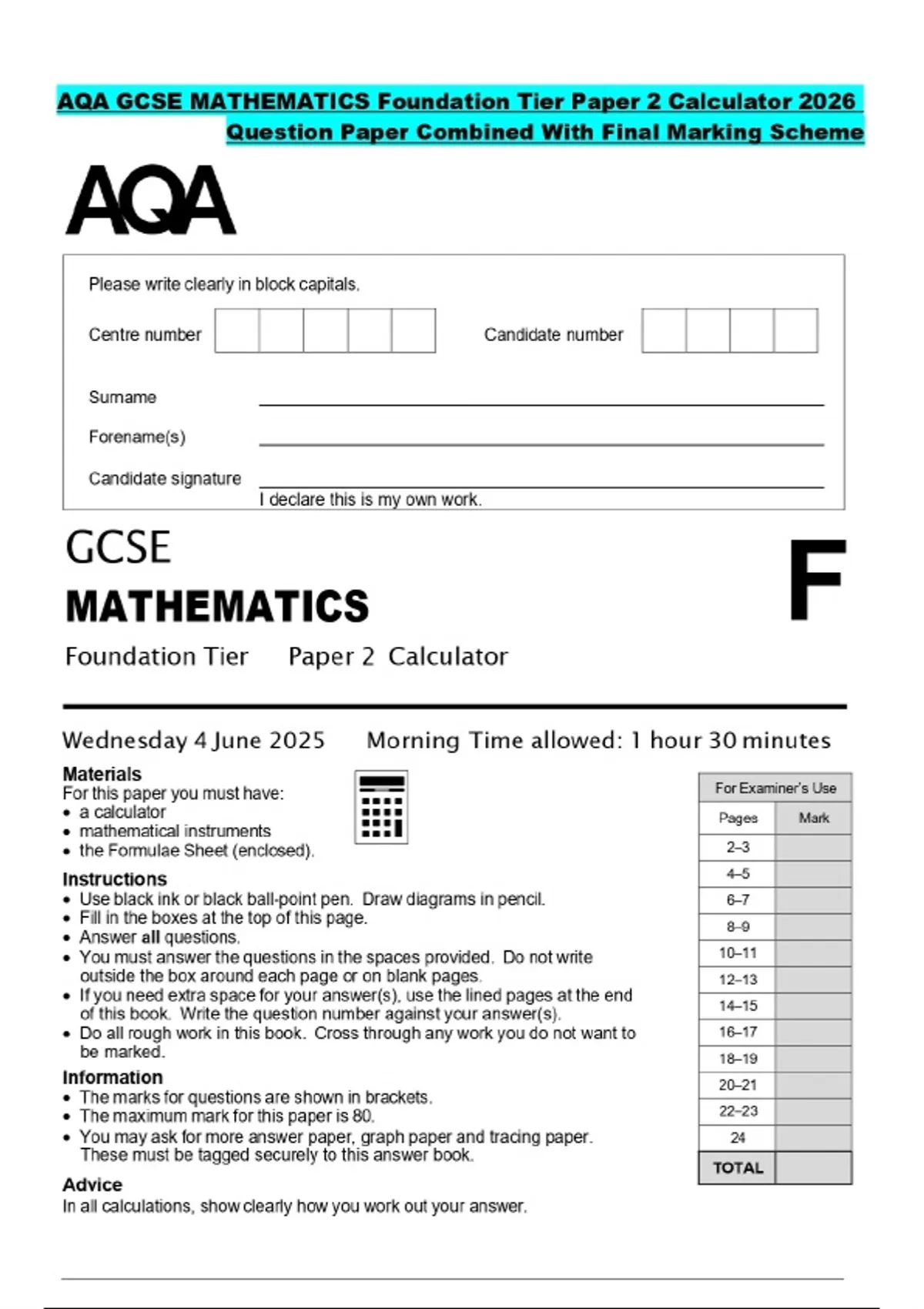 AQA GCSE MATHEMATICS Foundation Tier Paper 2 Calculator 2026 Question Paper Combined With Final Marking Scheme