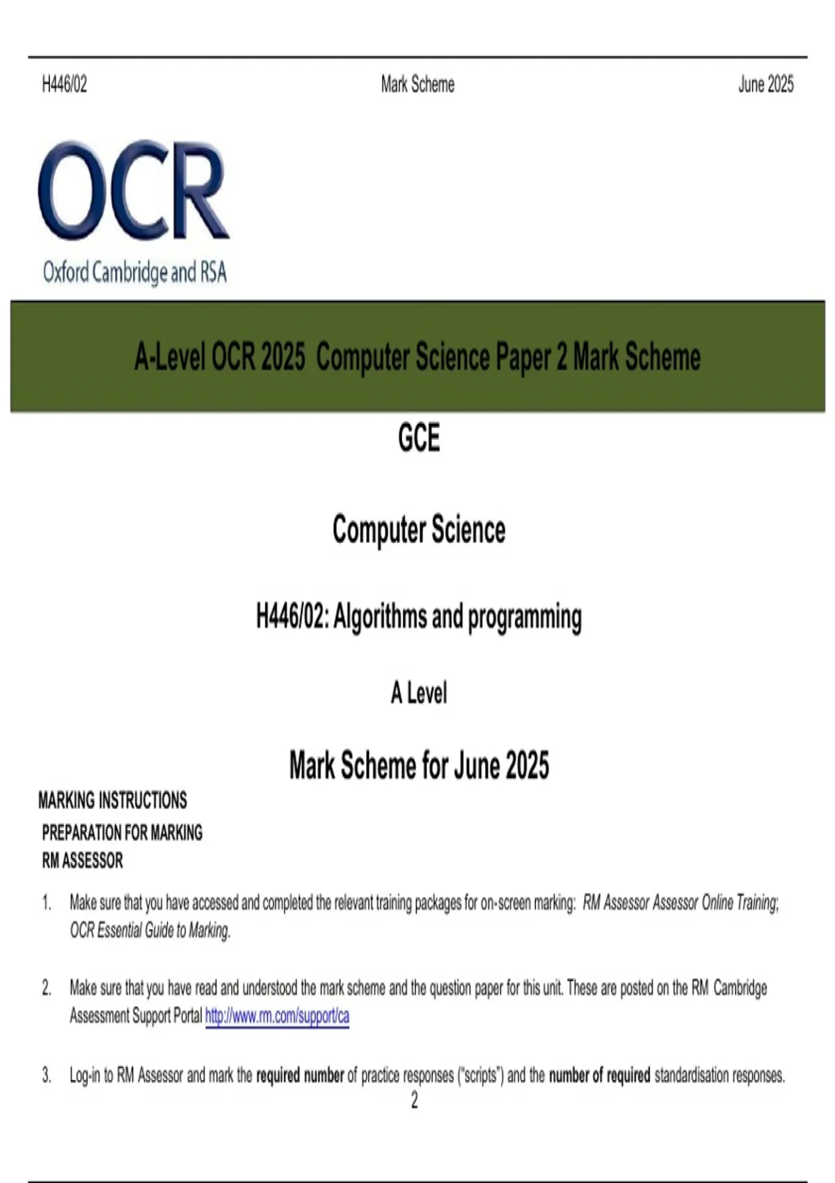 A-Level OCR 2025 Computer Science Paper 2 Mark Scheme