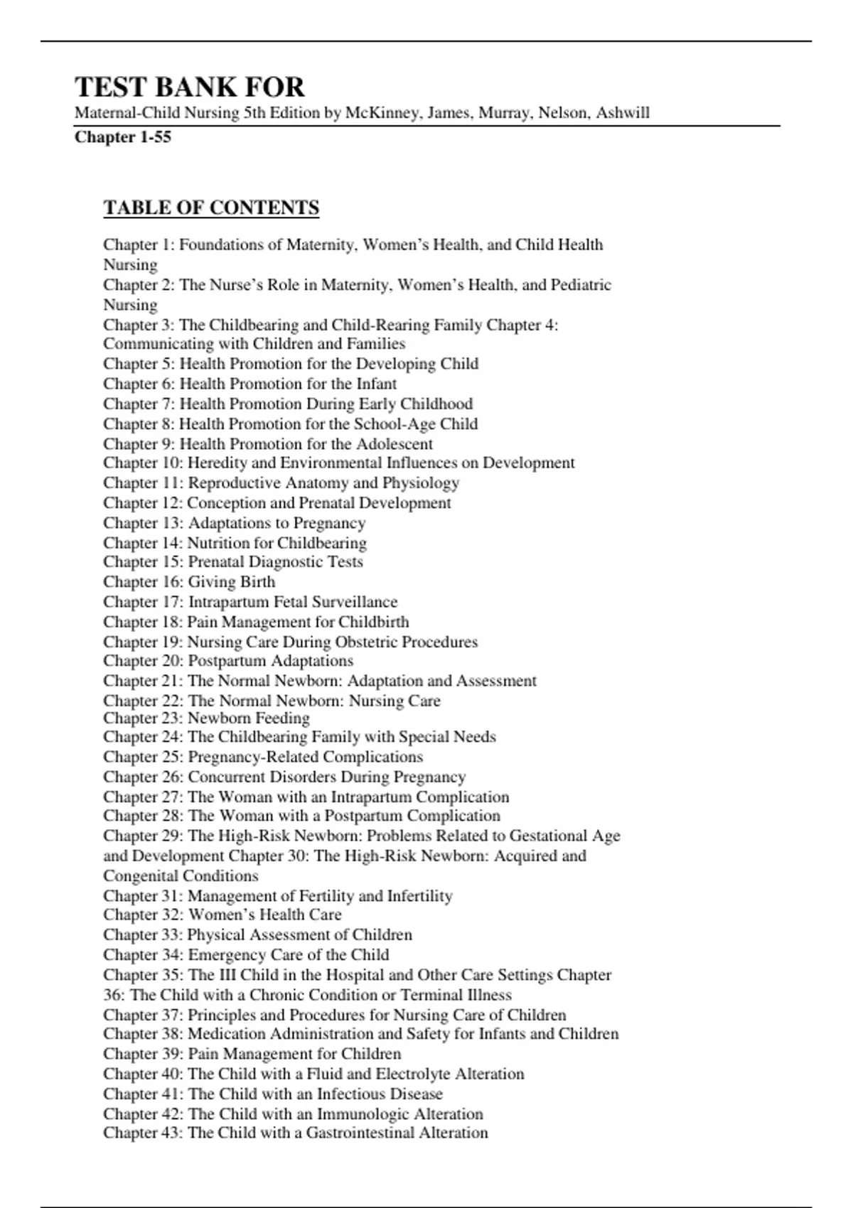 Test Bank For Maternal-Child Nursing 5th Edition by McKinney, James, Murray, Nelson, Ashwill Chapter 1-55 (Complete Guide A+)