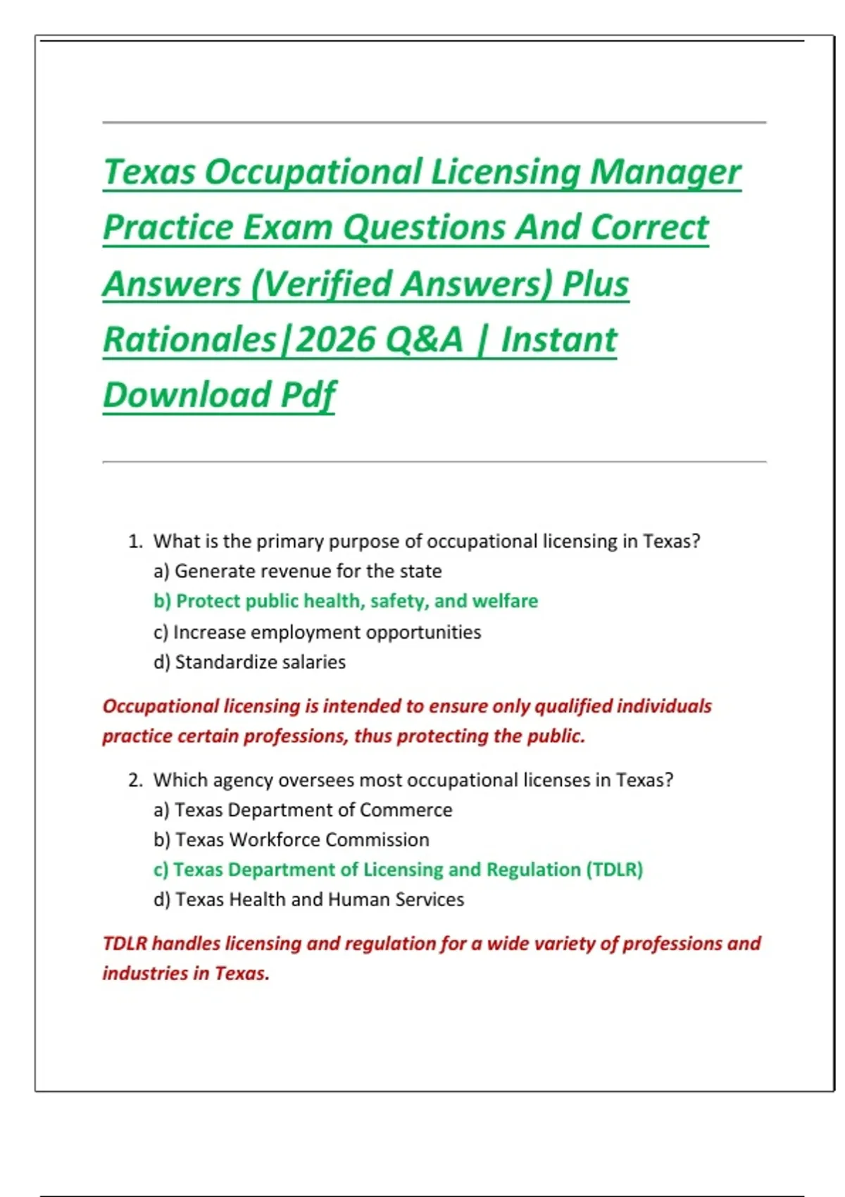 Texas Occupational Licensing Manager Practice Exam Questions And Correct Answers (Verified Answers) Plus Rationales|2026 Q&A | Instant Download Pdf