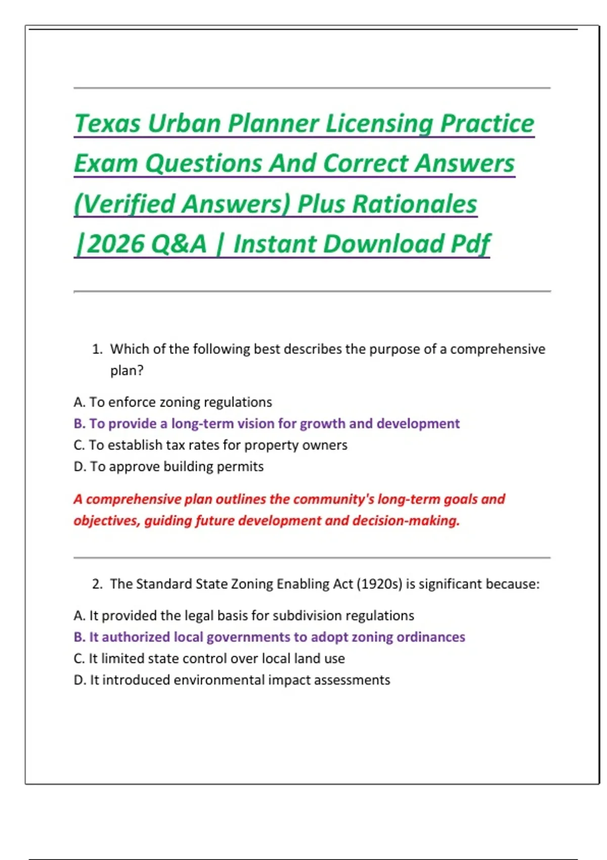Texas Urban Planner Licensing Practice Exam Questions And Correct Answers (Verified Answers) Plus Rationales |2026 Q&A | Instant Download Pdf