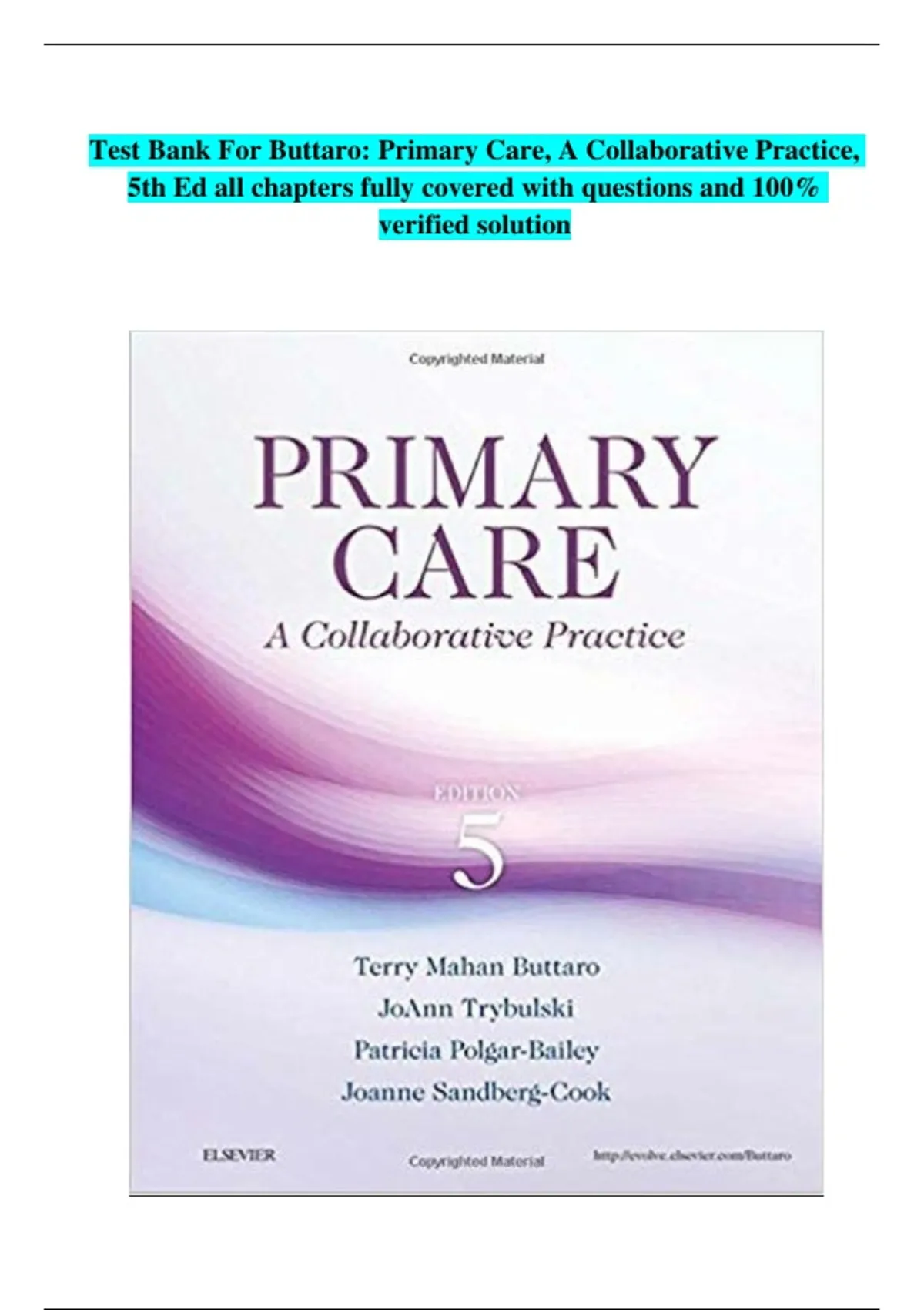 This document is a complete test bank for Primary Care: A Collaborative Practice (5th Edition) by Terry Mahan Buttaro and colleagues, covering the full scope of primary care practice. It includes exam-style questions with answers on health assessment, health promotion, disease prevention, diagnosis, and management across the lifespan, supporting exam preparation and clinical coursework.