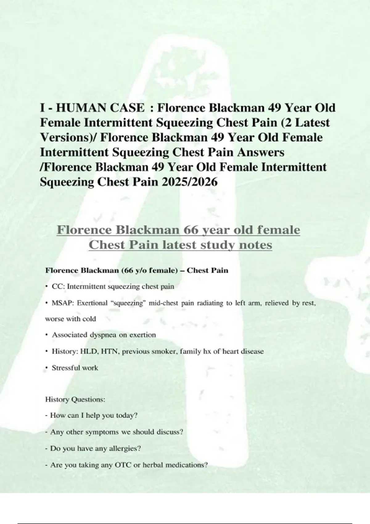 This document covers the I-Human clinical case of Florence Blackman, a 49-year-old female presenting with intermittent squeezing chest pain, including both of the latest case versions. It focuses on patient assessment, differential diagnosis, diagnostic testing, and clinical decision-making related to cardiovascular and chest pain evaluation. The material is suitable for case-based learning, exam preparation, and clinical reasoning practice.