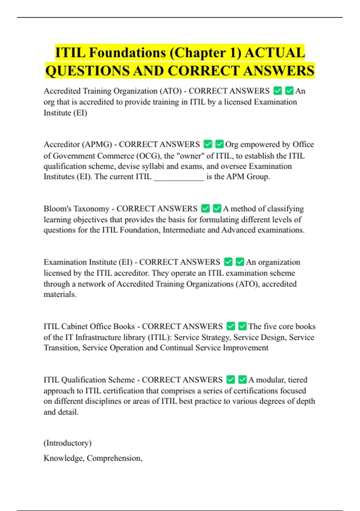 questions for the ITIL Foundation, Intermediate and Advanced examinations.