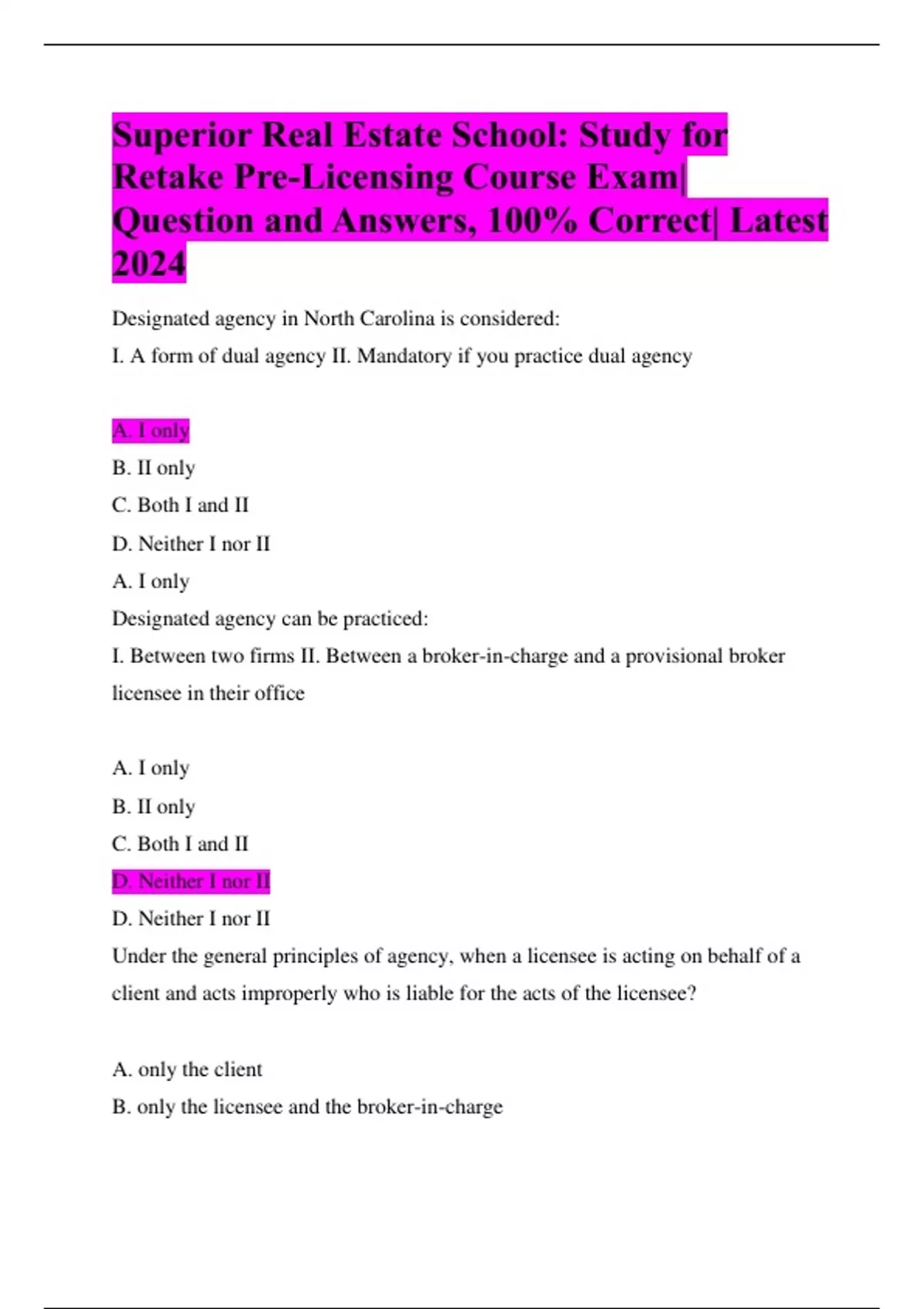 Superior Real Estate School: Study for Retake Pre-Licensing Course Exam| Question and Answers, 100% Correct| Latest 2024