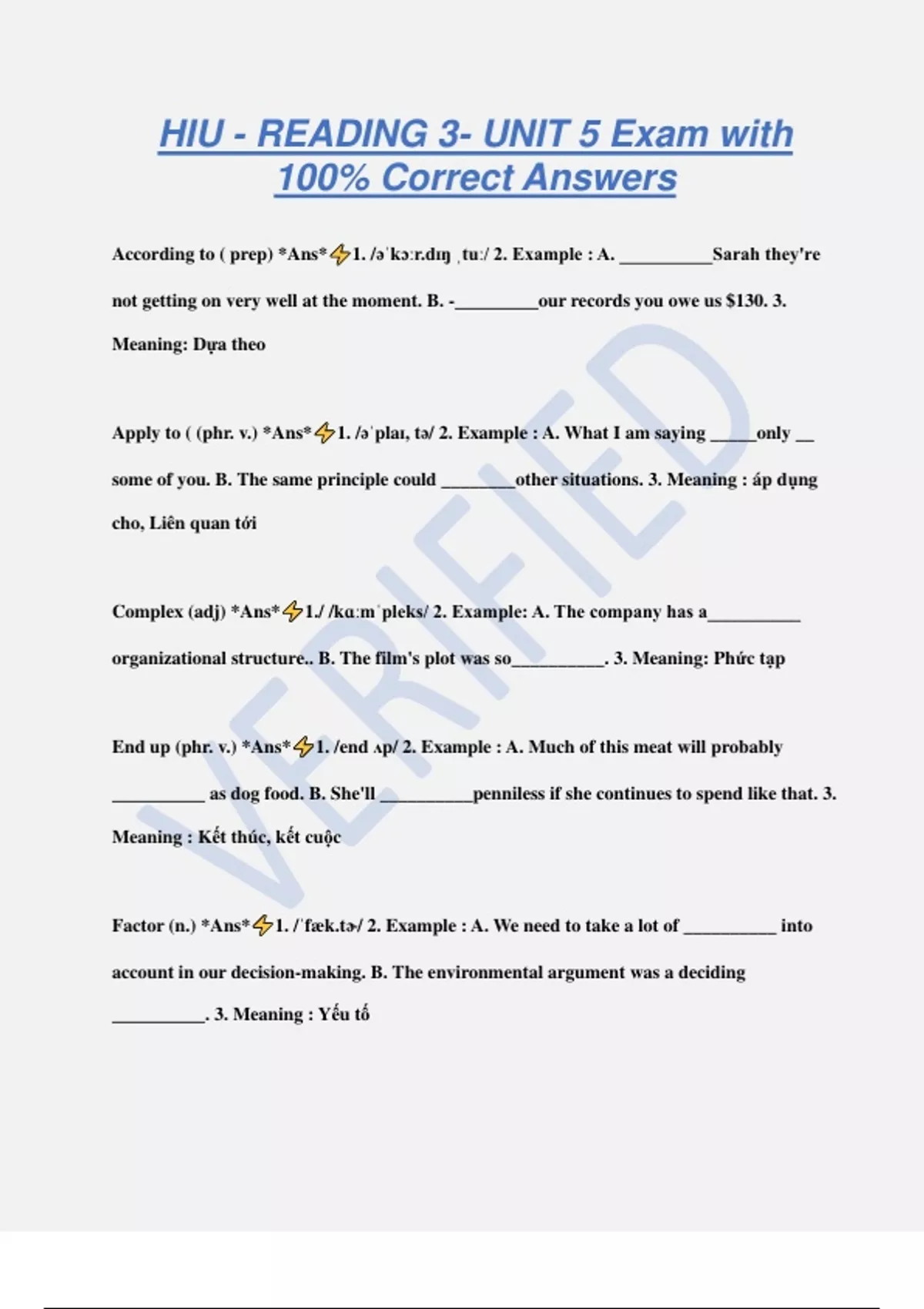 Compiled Exam Guide Workbook for HIU - READING 3- UNIT 1-6 with 100% Correct Answers