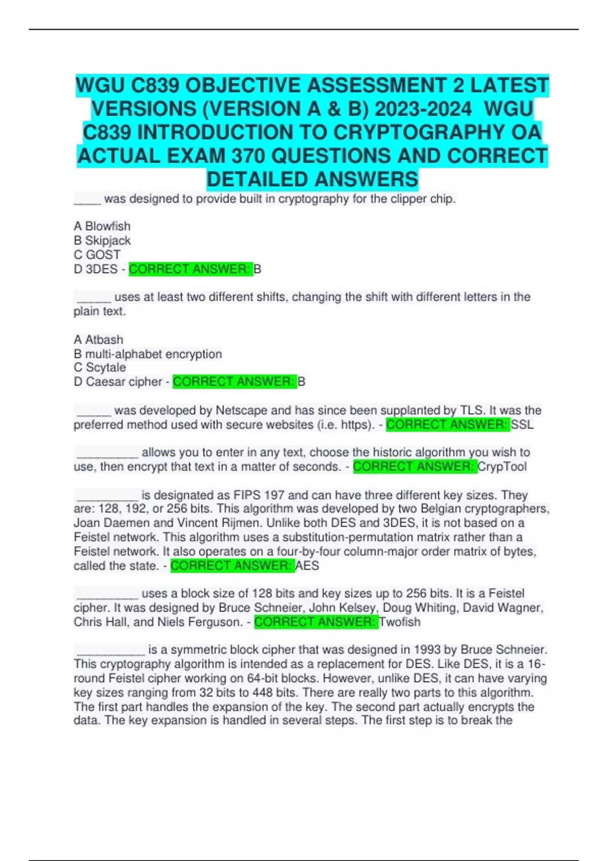 WGU COURSE C839 - INTRO TO CRYPTOGRAPHY LATEST UPDATE EXAMS