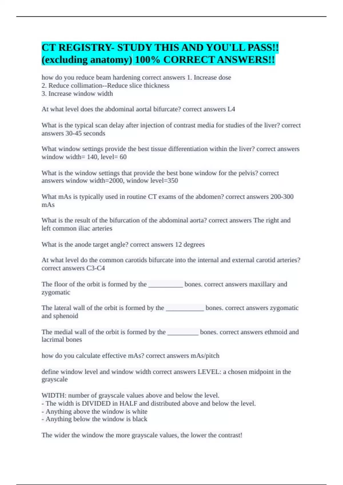 ARRT CT REGISTRY PHYSICS || 100% SOLVED SOLUTIONS!! CT Procedures - head/neck/chest, Final Anatomy, CT ANATOMY ARRT REGISTRY, CT imaging Procedures Registry review, Final -- Imaging Procedures, CT Head and Neck Procedures, Head and Neck Imaging Procedures, CT REGISTRY REVIEW || RATED 100% CORRECT ANSWERS!!