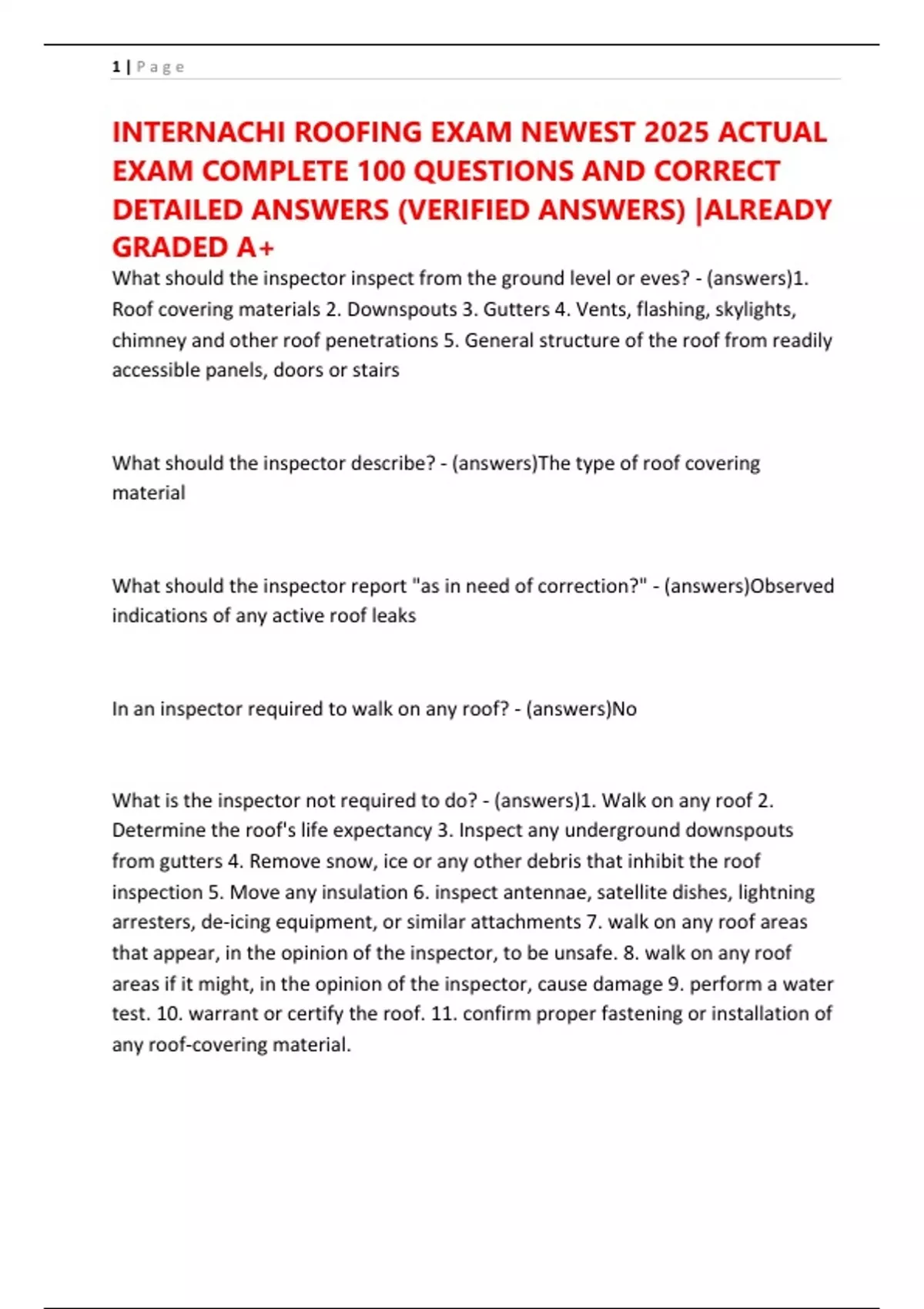 INTERNACHI ROOFING EXAM NEWEST 2025 ACTUAL EXAM COMPLETE 100 QUESTIONS AND CORRECT DETAILED ANSWERS (VERIFIED ANSWERS) |ALREADY GRADED A+
