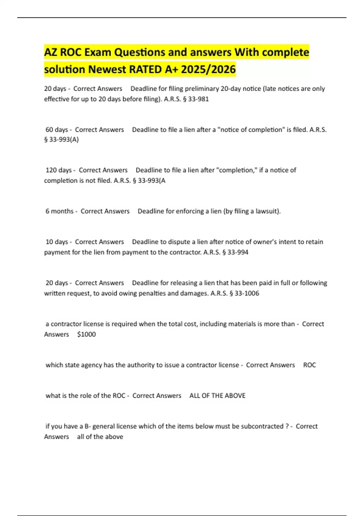 Exam (elaborations) AZ ROC Exam Questions and answers With complete solution Newest RATED A+ 2025/2026 2 Exam (elaborations) AZ ROC KB-1 Exam Questions and answers Newest RATED A+ 2025/2026 NEW!! 100% VERIFIED CORRECT 3 Exam (elaborations) AZ ROC Open AZ Statutes and Rules Exam Questions and answers Newest RATED A+
