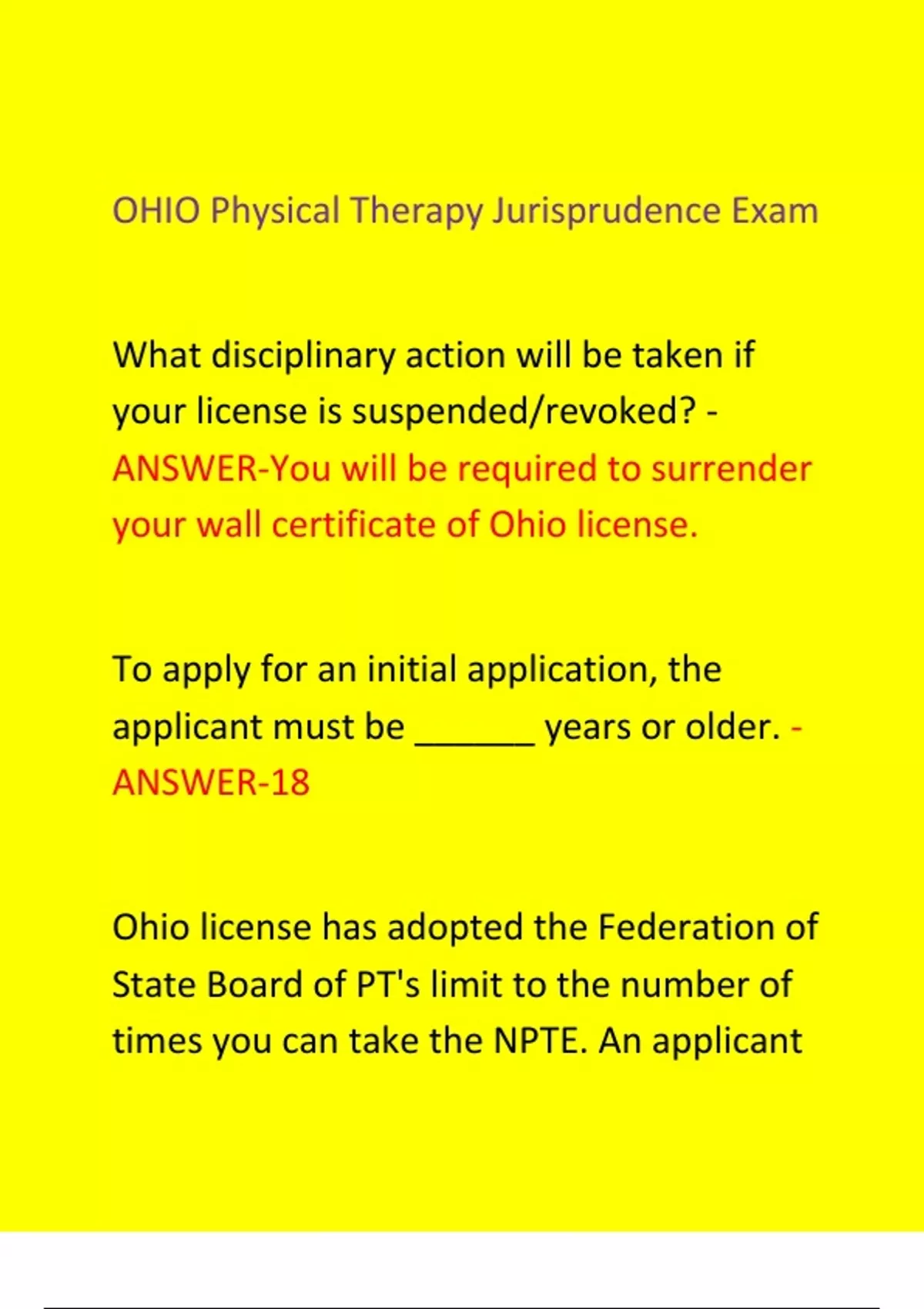 Ohio PTA(Physical Therapist Assistant) Jurisprudence Exam 2025–2026 Accurate Real Exam Questions This document contains real, verified exam questions with correct answers for the Ohio PTA (Physical Therapist Assistant) Jurisprudence Exam, updated for