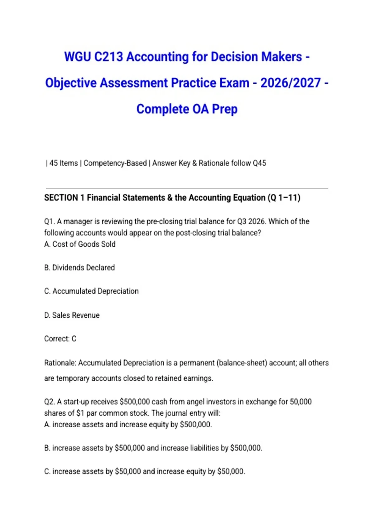 WGU C213 Accounting for Decision Makers COMPLETE EXAM BUNDLE - Latest 2026/2027 Updates | Final, Pre-Assessment, & Objective Assessment Exams | Questions & Verified Answers | 100% Correct