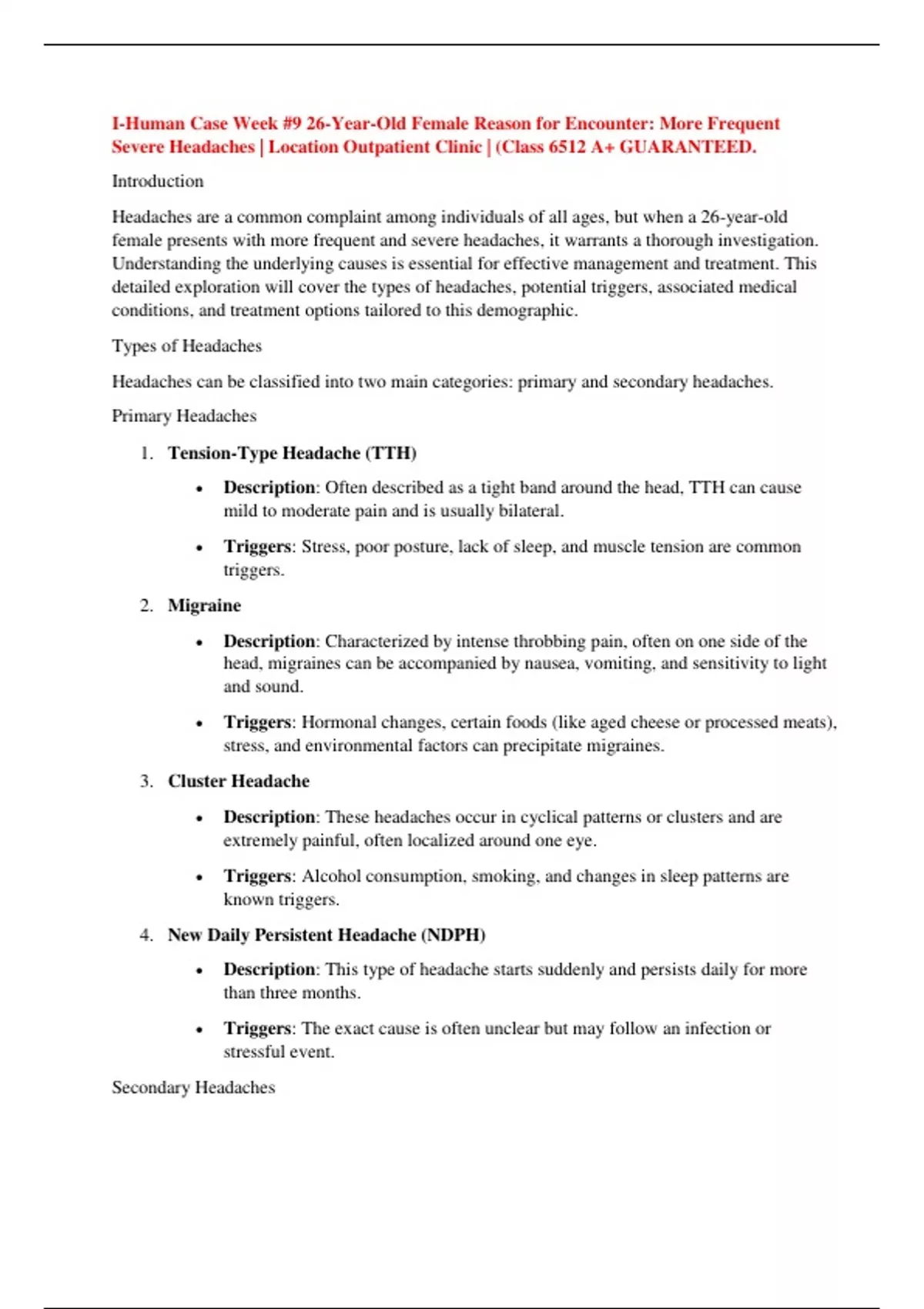 Summary I-Human Case Week #9 26-Year-Old Female Reason for Encounter: More Frequent Severe Headaches | Location Outpatient Clinic | (Class 6512