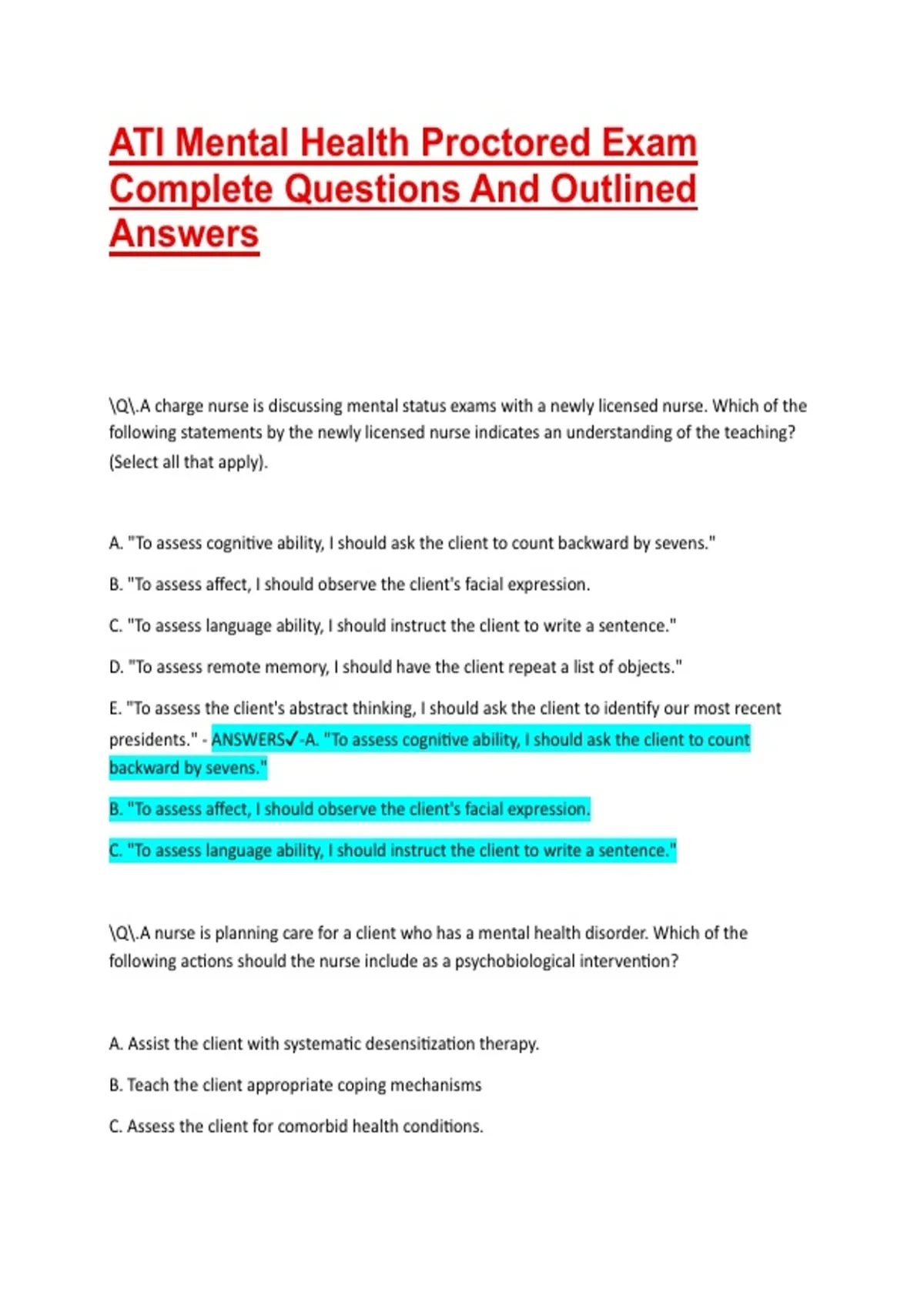 ATI Mental Health Practice B Complete Questions And 100% Outlined Answers| 2026 | verified exam questions|| 2 Exam (elaborations) /ATI Mental Health Proctored Exam Questions Complete With 100% Outlined Correct Answers | 2026 update | 100% pass 3 Exam (elaborations) /ATI Mental Health Proctored Actual Exam Questions And 100% Outlined And Verified