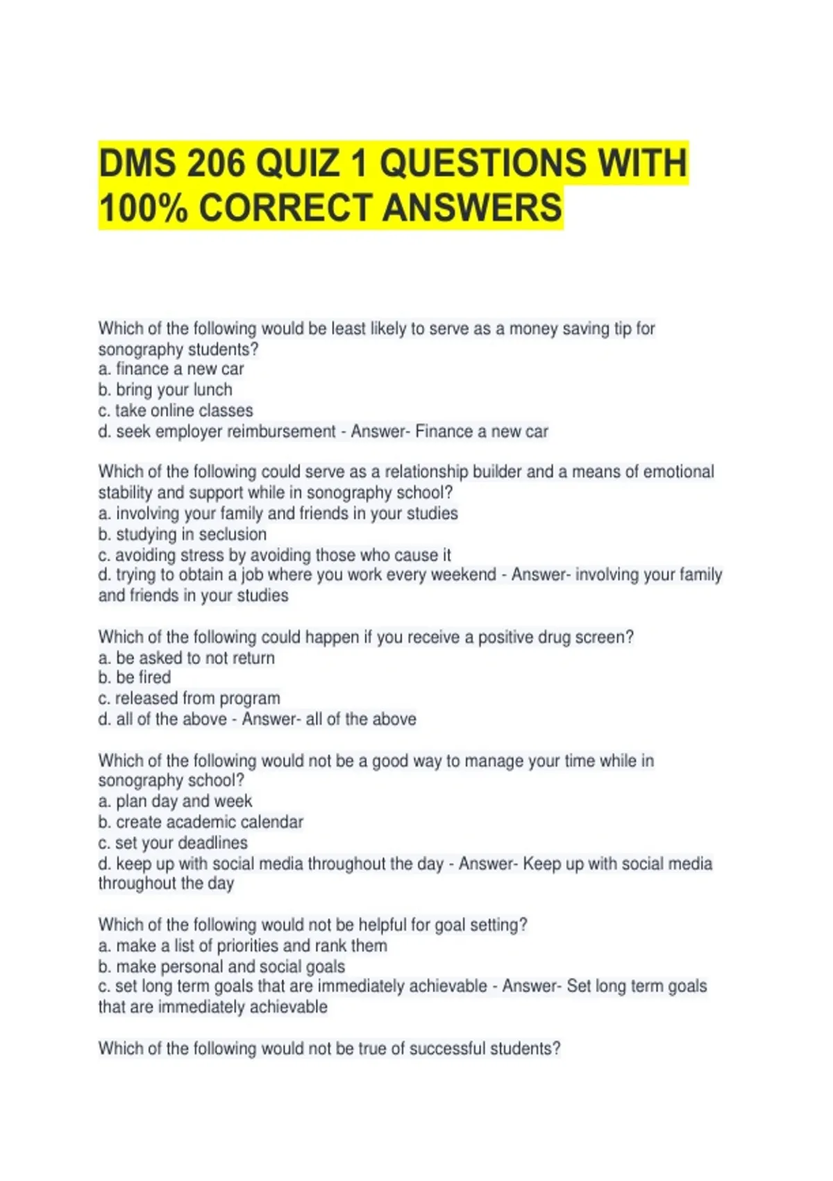 DMS 206 QUIZ 1 QUESTIONS WITH 100% CORRECT ANSWERS 2 Exam (elaborations) DMS 206 QUIZ 8 QUESTIONS AND ANSWERS 3 Exam (elaborations) DMS 206 TEST 2 QUESTIONS AND ANSWERS ALL CORRECT 4 Exam (elaborations) DMS 206 MIDTERM EXAM WITH COMPLETE SOLUTIONS