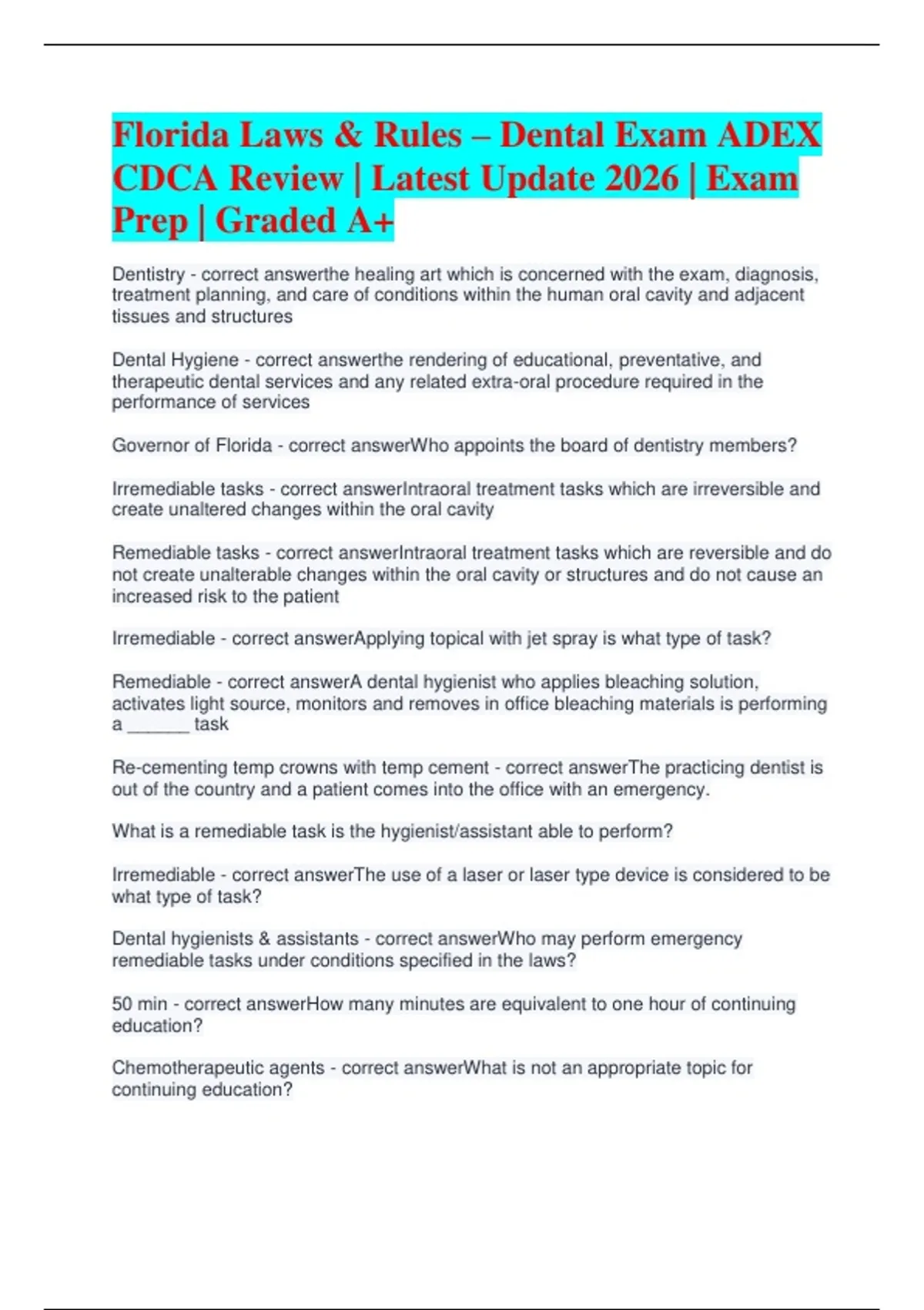 Florida Laws & Rules – Dental Exam ADEX CDCA Review | Latest Update 2026 | Exam Prep | Graded A+