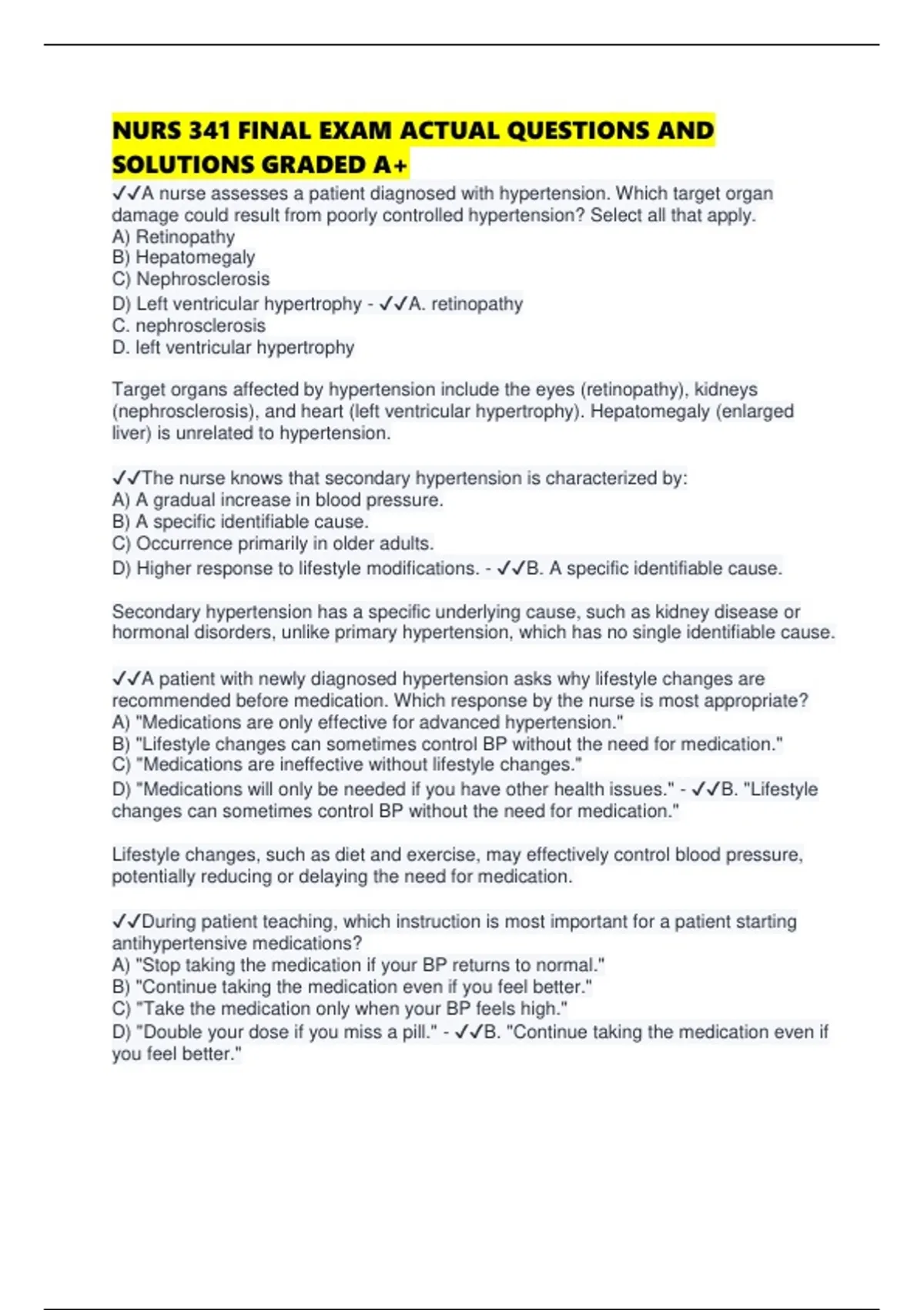 NURS 341 FINAL EXAM ACTUAL QUESTIONS AND SOLUTIONS GRADED A+