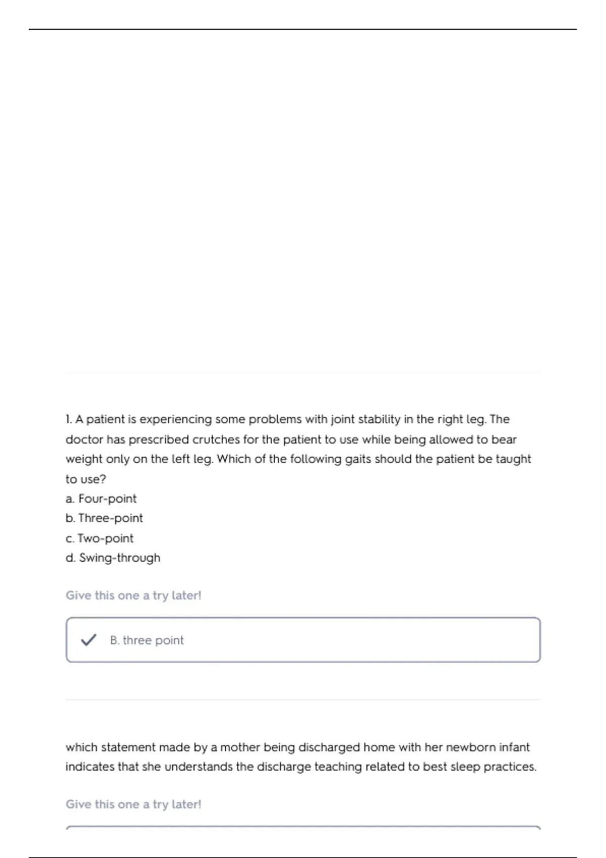 weight only on the left leg. Which of the following gaits should the patient be taught