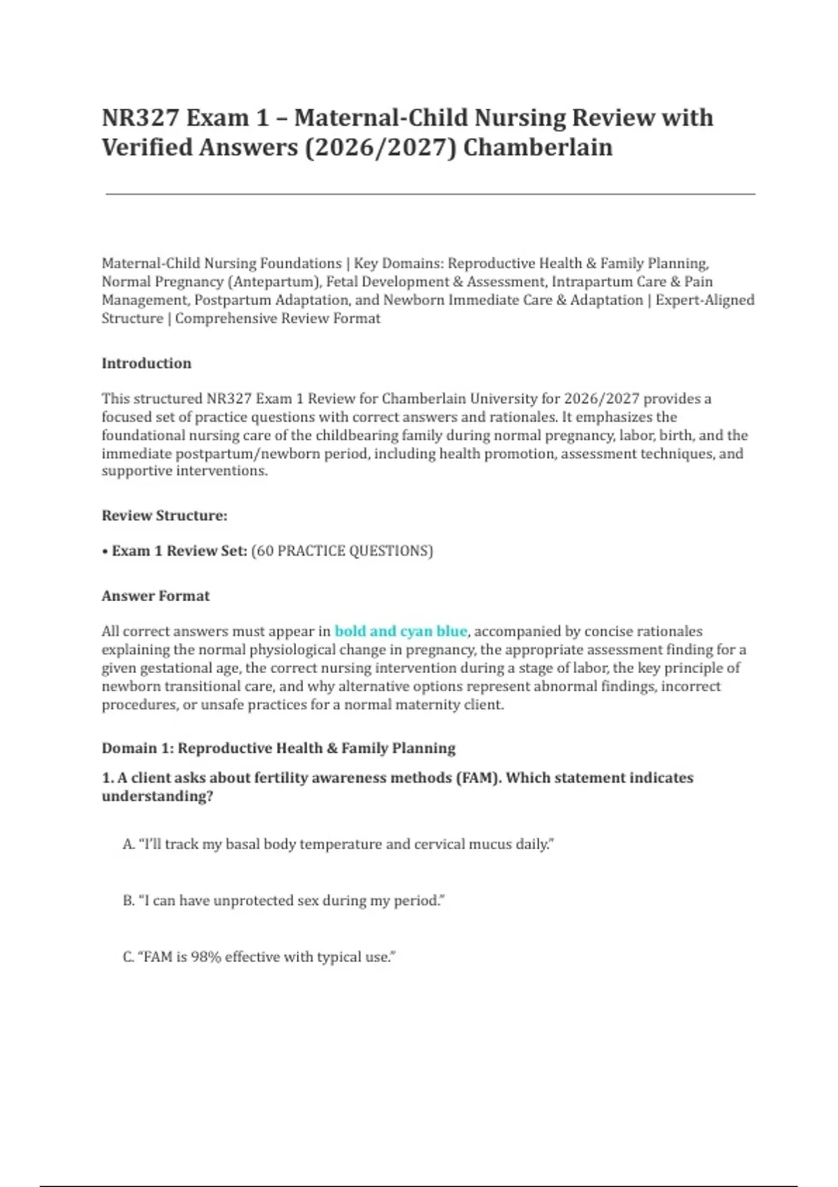 This structured NR327 Exam 1 Review for Chamberlain University for 2026/2027 provides a