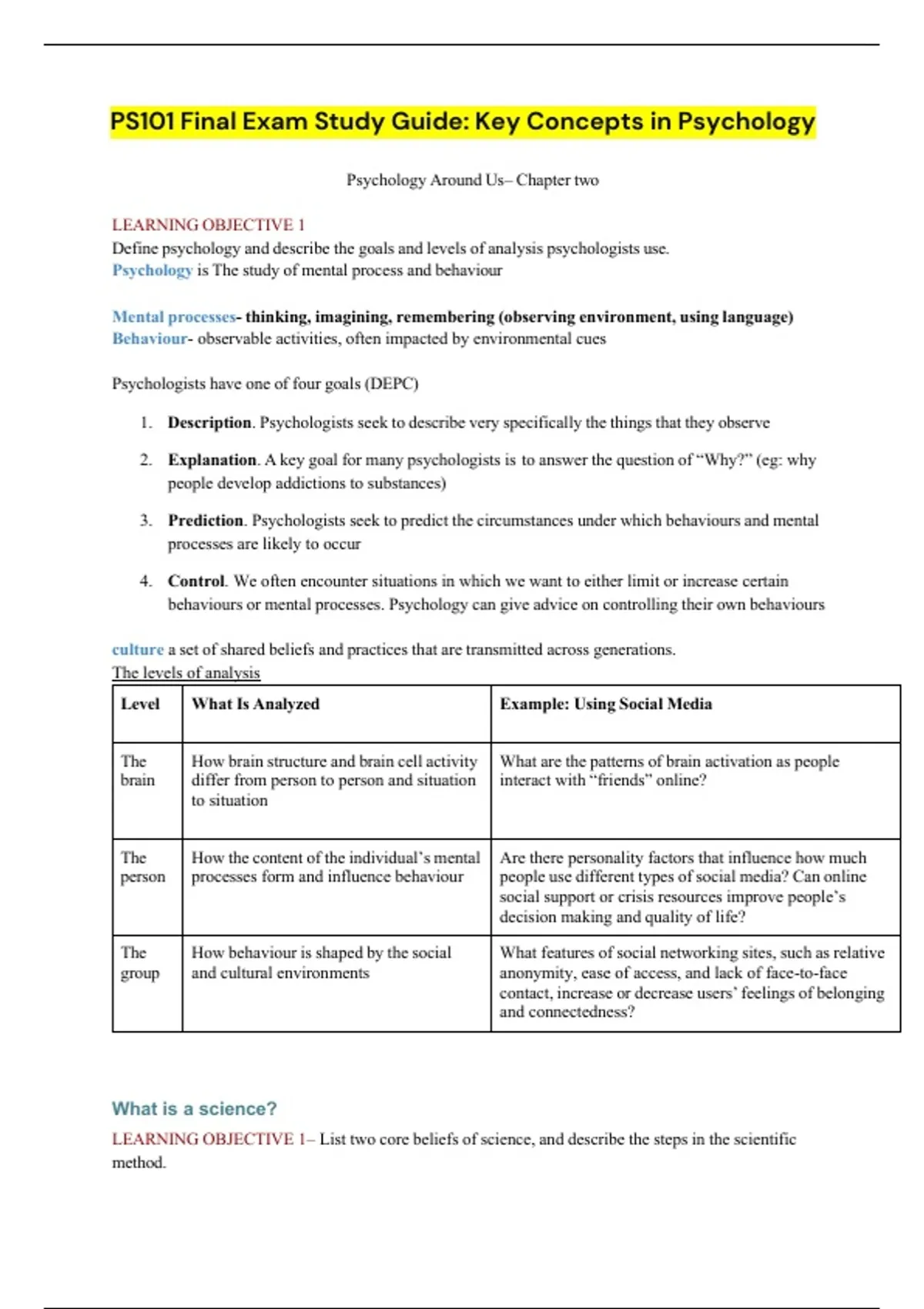 Define psychology and describe the goals and levels of analysis psychologists use.