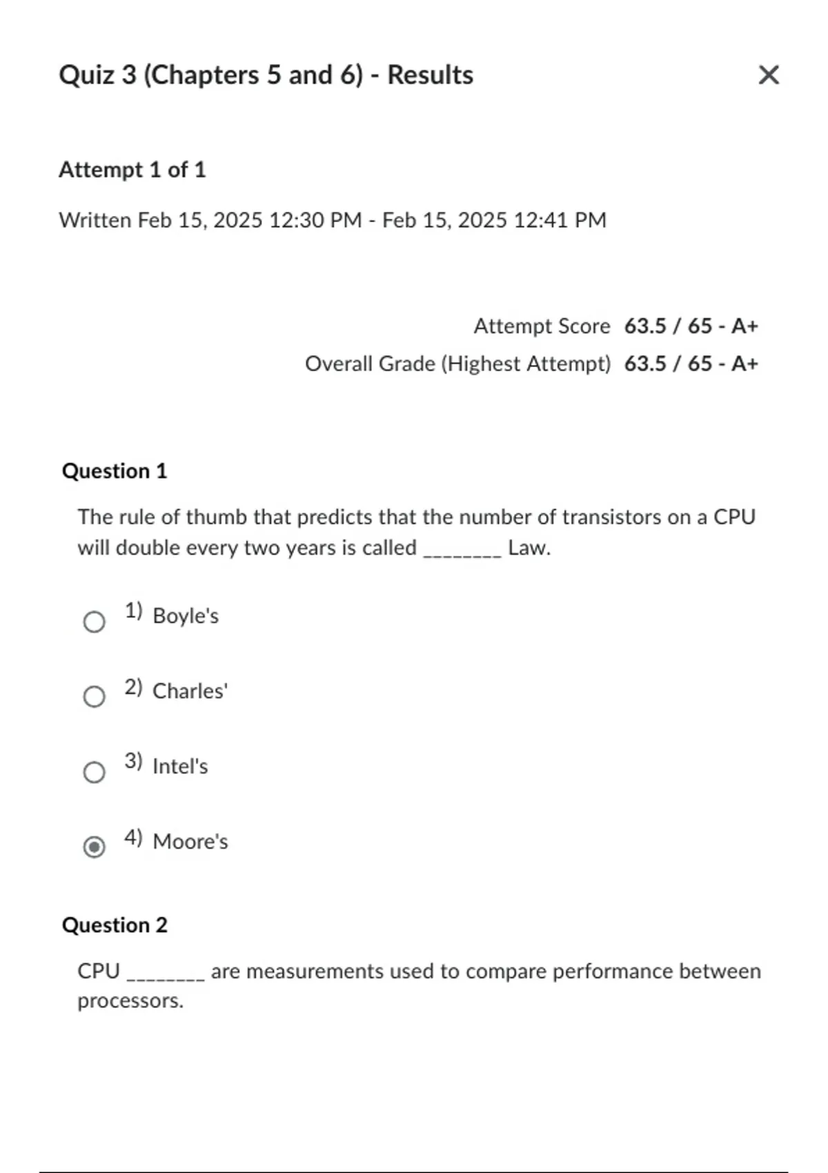 WLU Information Processing with Microcomputer Systems (CP102) Quiz 3 (Chapters 5 and 6) - Results - Attempt Score 63.5 / 65 - A+.