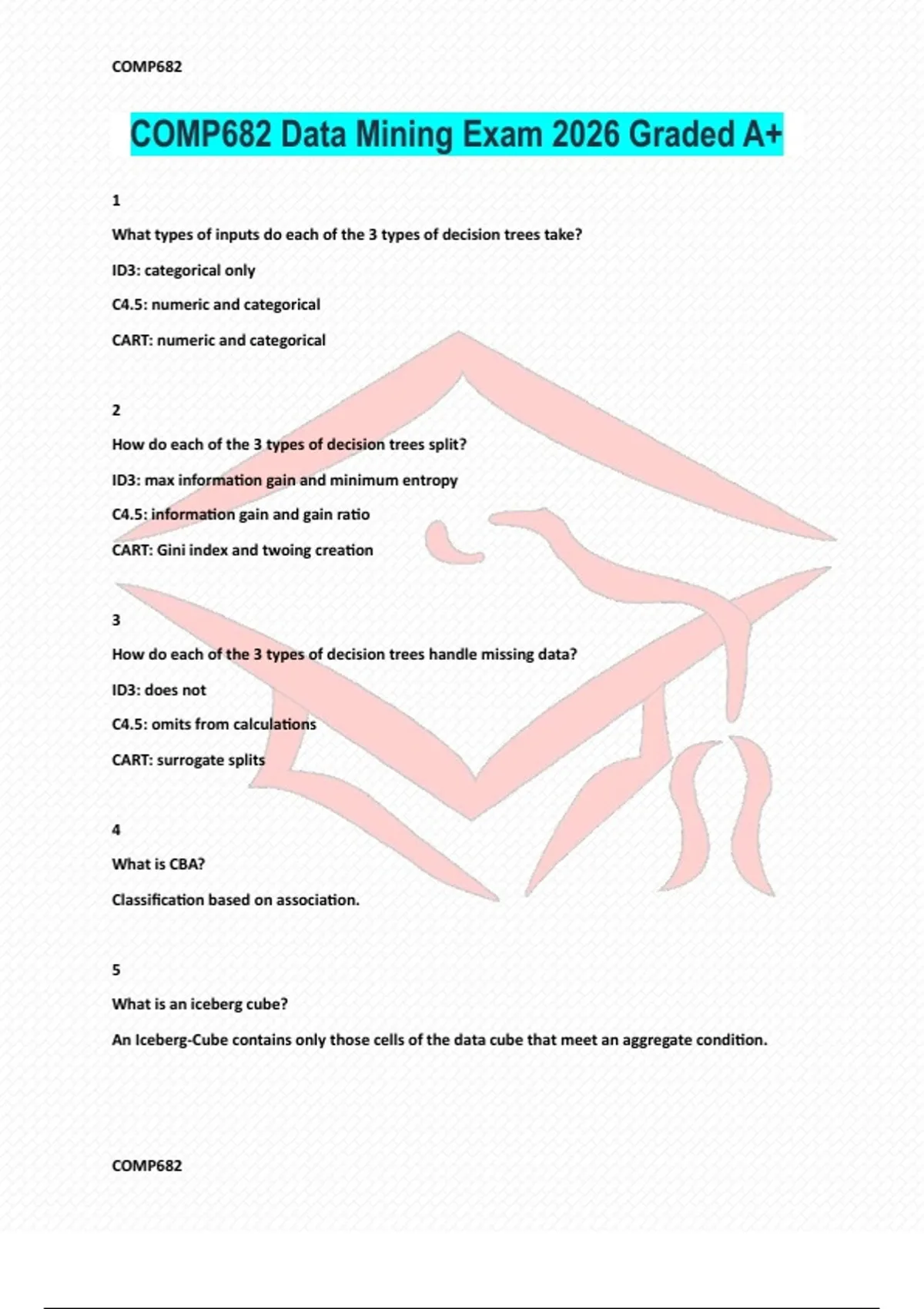 1 What types of inputs do each of the 3 types of decision trees take? ID3: categorical only C4.5: numeric and categorical CART: numeric and categorical 2 How do each of the 3 types of decision trees split? ID3: max information gain and minimum entropy C4.5: information gain and gain ratio CART: Gini index and twoing creation 3 How do each of the 3 types of decision trees handle missing data? ID3: does not C4.5: omits from calculations CART: surrogate splits 4 What is CBA? Classification based on association. 5 What is an iceberg cube? An Iceberg-Cube contains only those cells of the data cube that meet an aggregate condition.