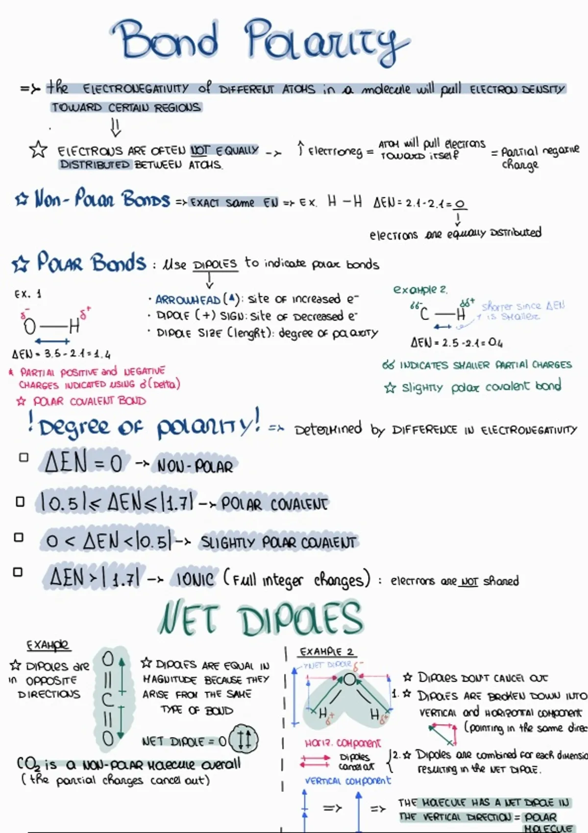 Topics covered Electronegativity and bond polarity Polar vs nonpolar bonds Dipole moments Molecular polarity Intermolecular forces: Hydrogen bonding Dipole–dipole interactions London dispersion forces Comparison between intermolecular forces Effects of intermolecular forces on physical properties Features Clear explanations in simple language Logical organization and clean layout Visual aids and examples to support understanding Focus on key concepts commonly tested in exams Details Level: 1st-year university Subject: General / Introductory Chemistry Format: PDF Language: English Length: ~10 pages ️ Unofficial personal study notes created for educational purposes only. Not affiliated with or endorsed by any institution.