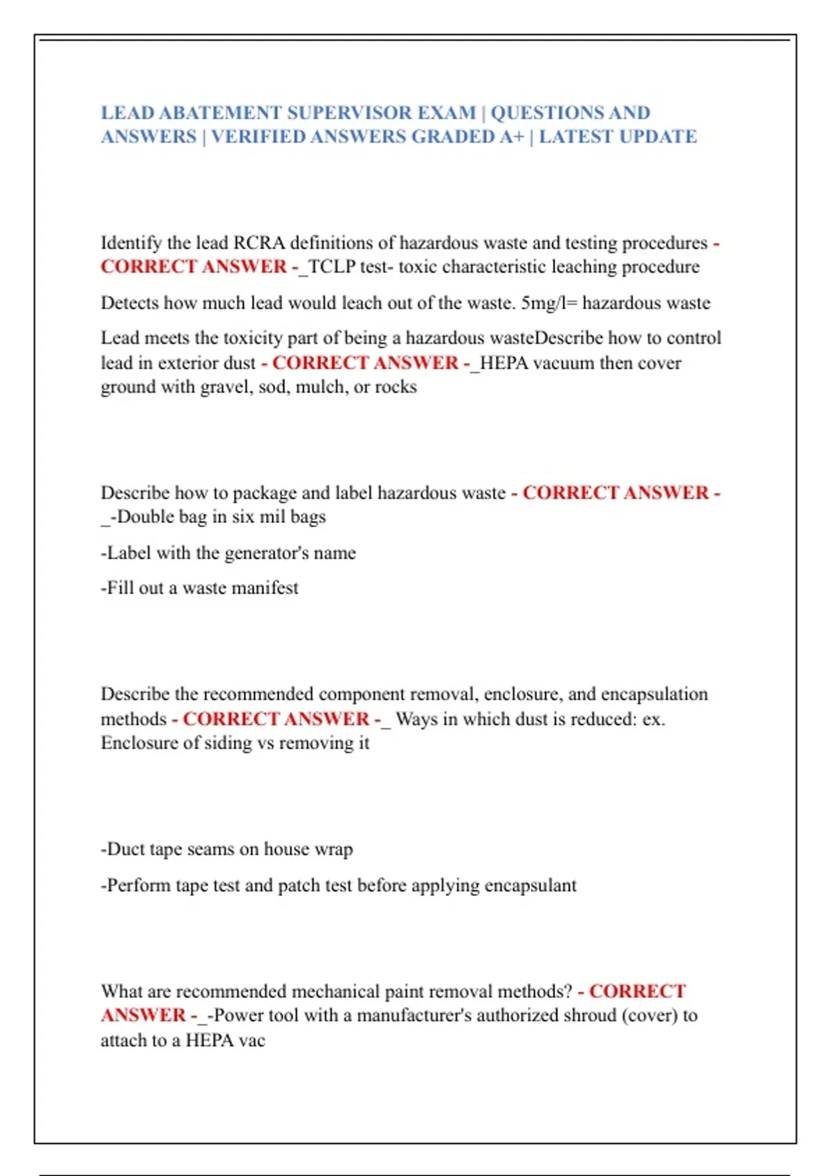 Up-to-date Lead Abatement Supervisor Exam questions featuring verified correct answers and clear explanations. Designed to support effective exam preparation, knowledge reinforcement, and confident test performance. Fully answered, professionally reviewed, and graded A+ for accuracy and reliability.