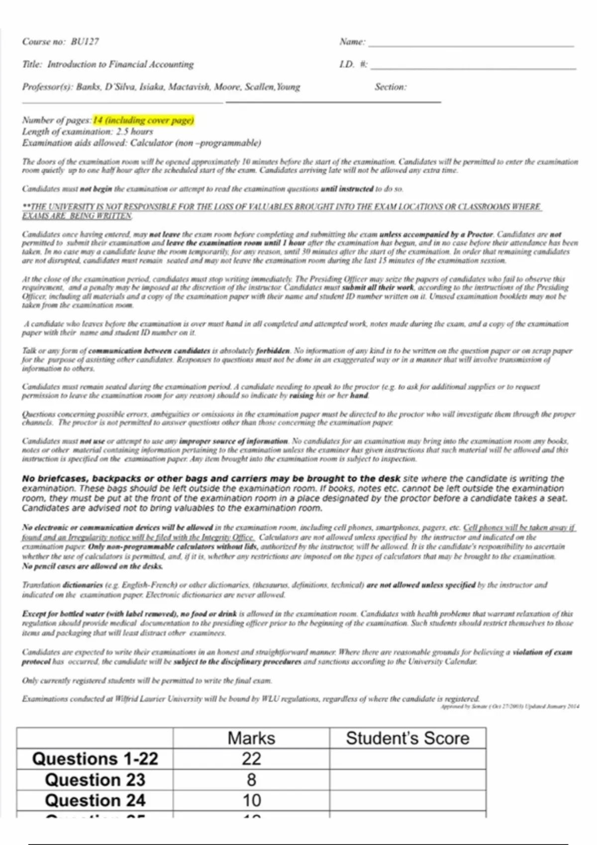 Intro to Financial Accounting (BU 127) - WLU; Final Exam | Complete questions and answers Latest updated 2026. Course no: BUI27 Name: Title: Imtroduction to Financial Accounting 1LD. #: Professor(s): Banks, D Silva, Isiaka, Mactavish, Moore, Scallen, Young Section: Number of pages: I4 (including cover page) Length of examination: 2.5 hours Examination aids allowed: Calculator (non ~programmable) The doors of the examination room will be opened approximately 10 minutes before the start of the examination. Candidates will be permitted to enter the examination room quietly up to one half hour after the scheduled start of the exam. Candidates arriving late will not be allowed any extra time. Candidates must not begin the examination or attempt to read the examination questions until instructed lo do so **THE UNIVERSITY IS NOT RESPONSIBLE FOR THE LOSS OF VALUABLES BROUGHT INTO THE EXAM LOCATIONS OR CLASSROOMS WHERE XAMS ARE BEING WRITTEN. Candidates once having entered. may not leave the exam room before completing and submitting the exam unless accompanied by a Proctor. Candidates are not permitted to submit their examination and leave the examination room until 1 hour after the examination has begun, and in no case before their attendance has been taken. In no case may a candidate leave the room temporarily, for any reason, until 30 minutes ajter the start of the examination. In order that remaining candidates are not disrupted, candidates must remain seated and may not leave the examination room during the last 15 minutes of the examination session At the close of the examination period. candidates must stop writing immediately. The Presiding Officer may seize the papers of candidates who fail to observe this requirement, and a penalty may be imposed at the discretion of the instructor Candidates must submit all their work, according 1o the instructions of the Presiding Officer. including all materials and a copy of the examination paper with their name and student 1D number written on it. Unused examination booklets may not be taken from the examination room. A candidate who leaves before the exanunation is over must hand in all completed and attempted work, notes made during the exam, and a copy of the examination paper with their name and student 1D mumber on it Talk or any form of communication between candidates is absolutely forbidden. No information of any kind is to be written on the question paper or on scrap paper for the purpose of assisting other candidates. Responses to questions must not be done in an exaggerated way or in a manner that will involve transmission of information to others. Candidates must remain seated during the examination period. A candidate needing to speak to the proctor (e.g. to ask for additional supplies or to request permission to leave the examination room Jor any reason) should so indicate by raising his or her hand. Questions concerning possible errors, ambiguities or omissions in the examination paper must be directed to the proctor who will investigate them through the proper channels. The proctor is not permitted to answer questions other than those concerming the examination paper Candidates must not use or attemp! to use any improper source of information. No candidates for an examination may bring into the examination room any books, notes or other material containing information periaining to the examination unless the examiner has given instructions that such material will be allowed and this instruction is specified on the examination paper. Any item brought into the examination room is subject to inspection. No briefcases, backpacks or other bags and carriers may be brought to the desk site where the candidate is writing the examination. These bags should be left outside the examination room. If books, notes etc. cannot be left outside the examination room, they must be put at the front of the examination room in a place designated by the proctor before a candidate takes a seat. Candidates are advised not to bring valuables to the examination room. No electronic or communication devices will be allowed in the examination room, including cell phones, smartphones, pagers, ete. Cell phones will be taken away if found and an Irregularity notice willbe filed with the Integrity Office. Caleulators are not allowed unless specified by the instructor and indicated on the examination paper: Only non-programmable calculators without lids, authorized by the instructor, will be allowed. It is the candidare’s responsibility to ascertain whether the use of calculators is permitted, and. if it is, whether any restrictions are imposed on the nypes of calculators that may be brought to the examination No pencil cases are allowed on the desks. Translation dictionaries (¢.g. English- French) or other dictionaries. (thesawrus, defimitions, technical) are not allowed unless specified by the instructor and indicated on the examination paper. Electronic dictionaries are never allowed. Except for bottled water (with label removed), ne food or drink is allowed in the examination room. Candidates with health problems that warrant relaxation of this regulation should provide medical documentation to the presiding officer prior to the beginning of the examination. Such students should restrict themselves to those items and packaging that will least distract other examinees. Candidates are expected to write their examinations in an honest and straightforward manner. Where there are reasonable grounds jor believing a violation of exam protoceol has occurred, the candidate will be subject to the disciplinary procedures and sanctions acconding to the University Calendar. Only currently registered students will be permitied to write the final exam Examinations conducted at Wilfrid Laurier University will be bound by WLU regulations, regardless of where the candidate is registered. dpproned by Semave ( Okt 2722003) Updased Jamwary 2014 Marks Student’s Score Questions 1