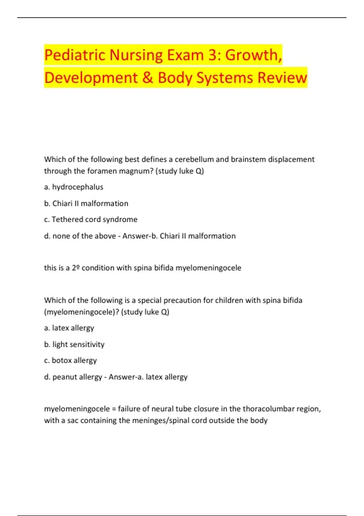 Which of the following best defines a cerebellum and brainstem displacement through the foramen magnum? (study luke Q) a. hydrocephalus b. Chiari II malformation c. Tethered cord syndrome d. none of the above - Answer-b. Chiari II malformation this is a 2º condition with spina bifida myelomeningocele Which of the following is a special precaution for children with spina bifida (myelomeningocele)? (study luke Q) a. latex allergy b. light sensitivity c. botox allergy d. peanut allergy - Answer-a. latex allergy