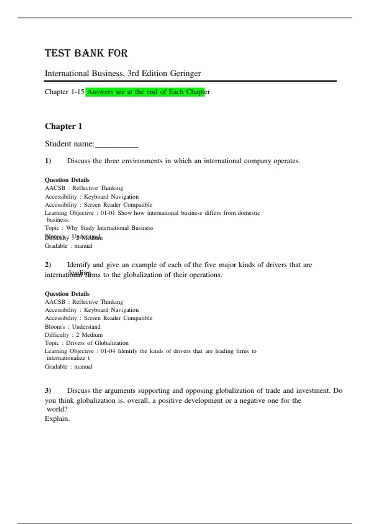 Complete Test Bank for International Business, 2025 Release Evergreen 3e 3rd Edition by Michael Geringer, Grigorios Livanis and Jeanne M. McNett. All Modules (Module 1 to 15 Plus Module A,B,C) are included with answers. Rationales Included. ISBN 9781265767181 Module 1: The Challenging Context of International Business Module 2: International Trade and Investment Module 3: Sociocultural Forces Module 4: Sustainability and Natural Resources Module 5: Political Forces That Affect Global Trade Module 6: Intellectual Property Rights and Other Legal Forces Module 7: Economic and Socioeconomic Forces Module 8: The International Monetary System and Financial Forces Module 9: International Competitive Strategy Module 10: Organizational Design and Control Module 11: Global Leadership Issues and Practices Module 12: International Markets: Assessment and Entry Modes Module 13: Marketing Internationally Module 14: Managing Human Resources in an International Context Module 15: International Accounting and Financial Management A: International Institutions from a Business Perspective B: Export and Import Practices C: Global Operations and Supply Chain Management