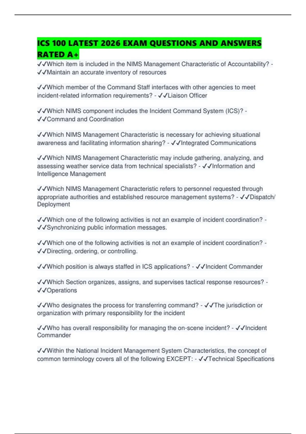 ICS 100 LATEST 2026 EXAM QUESTIONS AND ANSWERS RATED A+