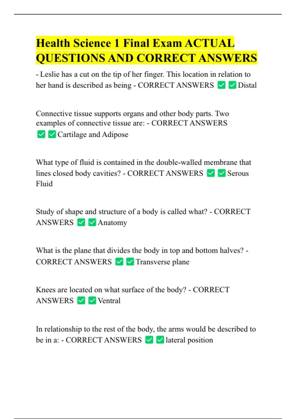 Health Science 1 Final Exam ACTUAL QUESTIONS AND CORRECT ANSWERS - Leslie has a cut on the tip of her finger. This location in relation to her hand is described as being - CORRECT ANSWERS Distal