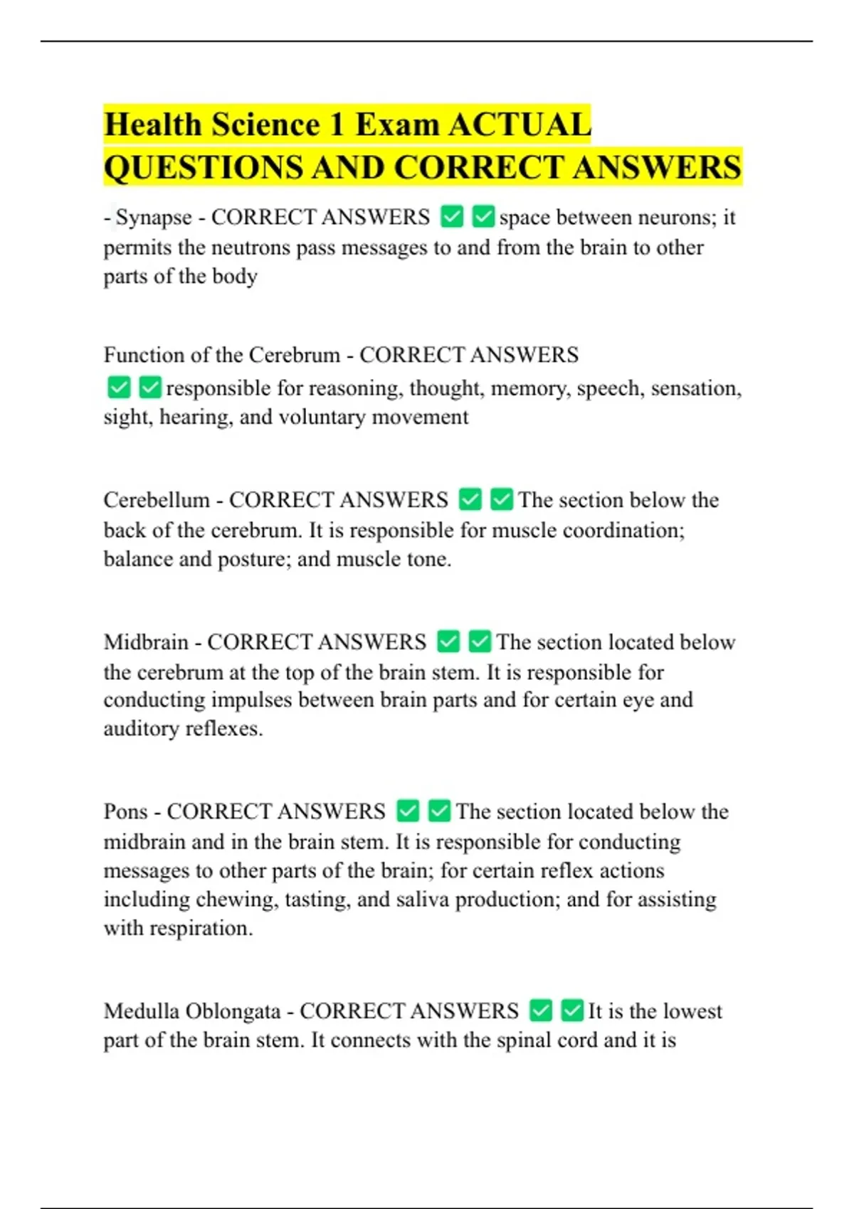 Health Science 1 Exam ACTUAL QUESTIONS AND CORRECT ANSWERS - Synapse - CORRECT ANSWERS space between neurons; it permits the neutrons pass messages to and from the brain to other parts of the body
