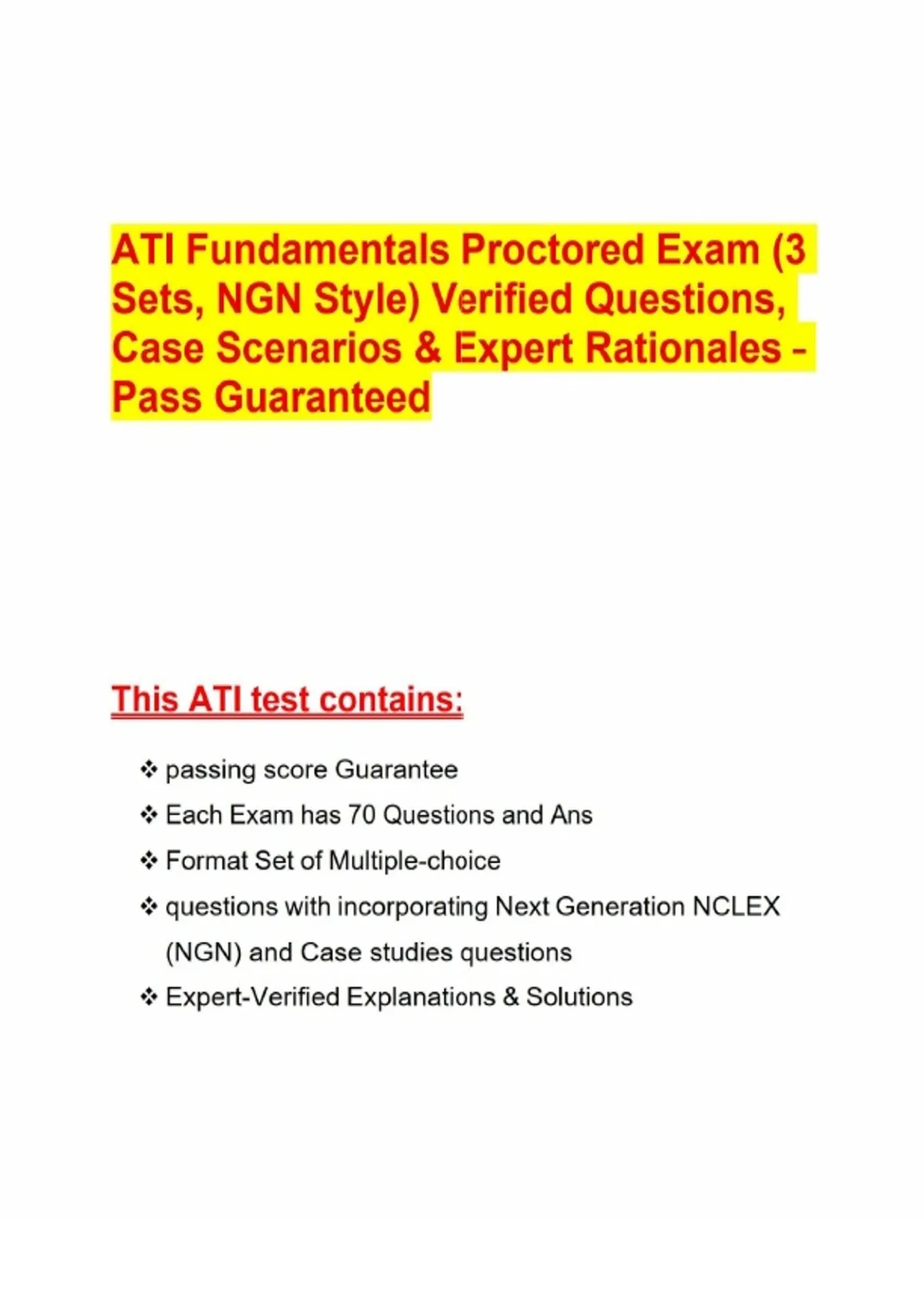 ATI Fundamentals Proctored Exam (3 Sets, NGN Style) Verified Questions, Case Scenarios & Expert Rationales – Pass GuaranteedATI Fundamentals Proctored Exam (3 Sets, NGN Style) Verified Questions, Case Scenarios & Expert Rationales – Pass GuaranteedPrepare with confidence for your ATI Fundamentals Proctored Exam using this Next Generation NCLEX (NGN) style resource bundle, designed to mirror the actual exam format and guarantee success. This premium package includes 3 complete exam sets (Set 1, Set 2, Set 3), each with 70 verified multiple‑choice questions (MCQs), case scenarios, and expert‑verified rationales—giving you a total of 210 questions to ensure you’re ready to pass on the first attempt. Features: - 3 Full Exam Sets (Set 1, Set 2, Set 3) - 210 Actual Questions & Answers with structured rationales - 100% Pass Guarantee for exam readiness - NGN‑Style Case Scenarios & Select‑All‑That‑Apply Items integrated into the question sets - Expert‑Verified Rationales explaining correct and incorrect answers - Evidence‑Based Content aligned with ATI and NCLEX standards - Accessible Format for flexible study anytime, anywhere Sample Topics Covered Across All 3 Sets: - Oncology & Labs: Chemotherapy clients with thrombocytopenia, lab values indicating bleeding risk - Legal & Ethics: Advance directives, HIPAA compliance, negligence vs. malpractice - Assistive Devices & Mobility: Cane use, ankle‑foot orthotics, fall risk vision assessments - Infection Control: TB airborne precautions, pneumonia droplet precautions, wound infection indicators - Pharmacology: Oral liquid medication administration, otic medication technique, insulin mixing ordered response - Nutrition & Prevention: Osteoporosis risk reduction strategies, malnutrition assessments, colon cancer screening guidelines - Client Safety: Seizure precautions, postoperative complications, medication reconciliation
