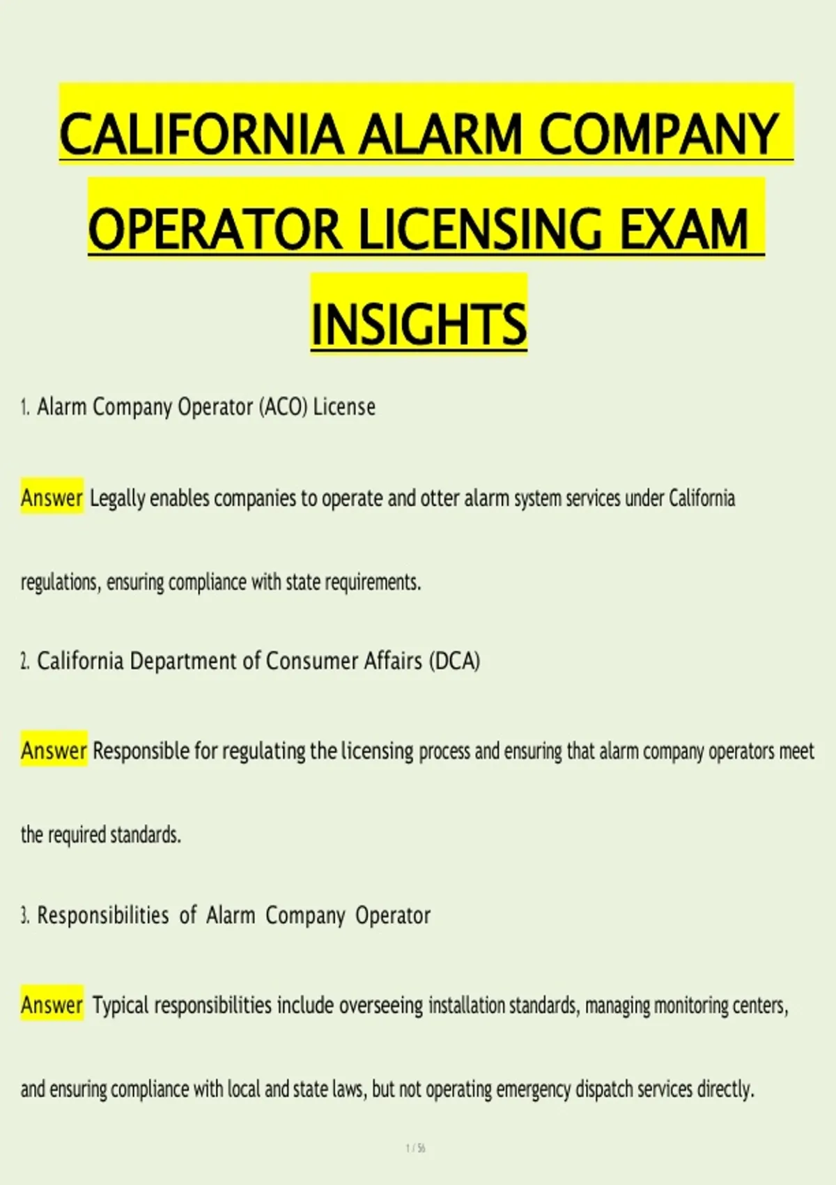 Prepare thoroughly for the California Alarm Company Operator Licensing Exam with this comprehensive study guide designed for aspiring alarm company operators seeking certification. This guide includes realistic practice questions with fully verified answers, covering all key topics such as California alarm regulations, licensing requirements, security systems installation and monitoring, alarm response protocols, legal responsibilities, and safety standards. Each question reflects the actual exam format, helping candidates build confidence, reinforce essential knowledge, and improve accuracy in practical scenarios. Updated for 2026, this resource also offers strategies for effective time management and exam-taking, making it ideal for self-study, review, or as a companion to training programs. Using this guide, candidates can strengthen understanding, enhance preparedness, and maximize their chances of passing the California Alarm Company Operator Licensing Exam.