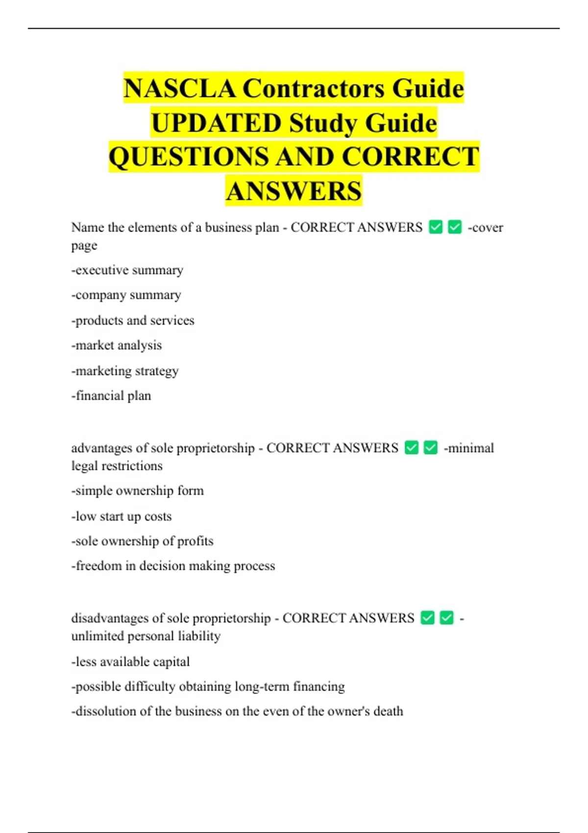NASCLA Contractors Guide UPDATED Study Guide QUESTIONS AND CORRECT ANSWERS Name the elements of a business plan - CORRECT ANSWERS page -executive summary -company summary -products and services -market analysis