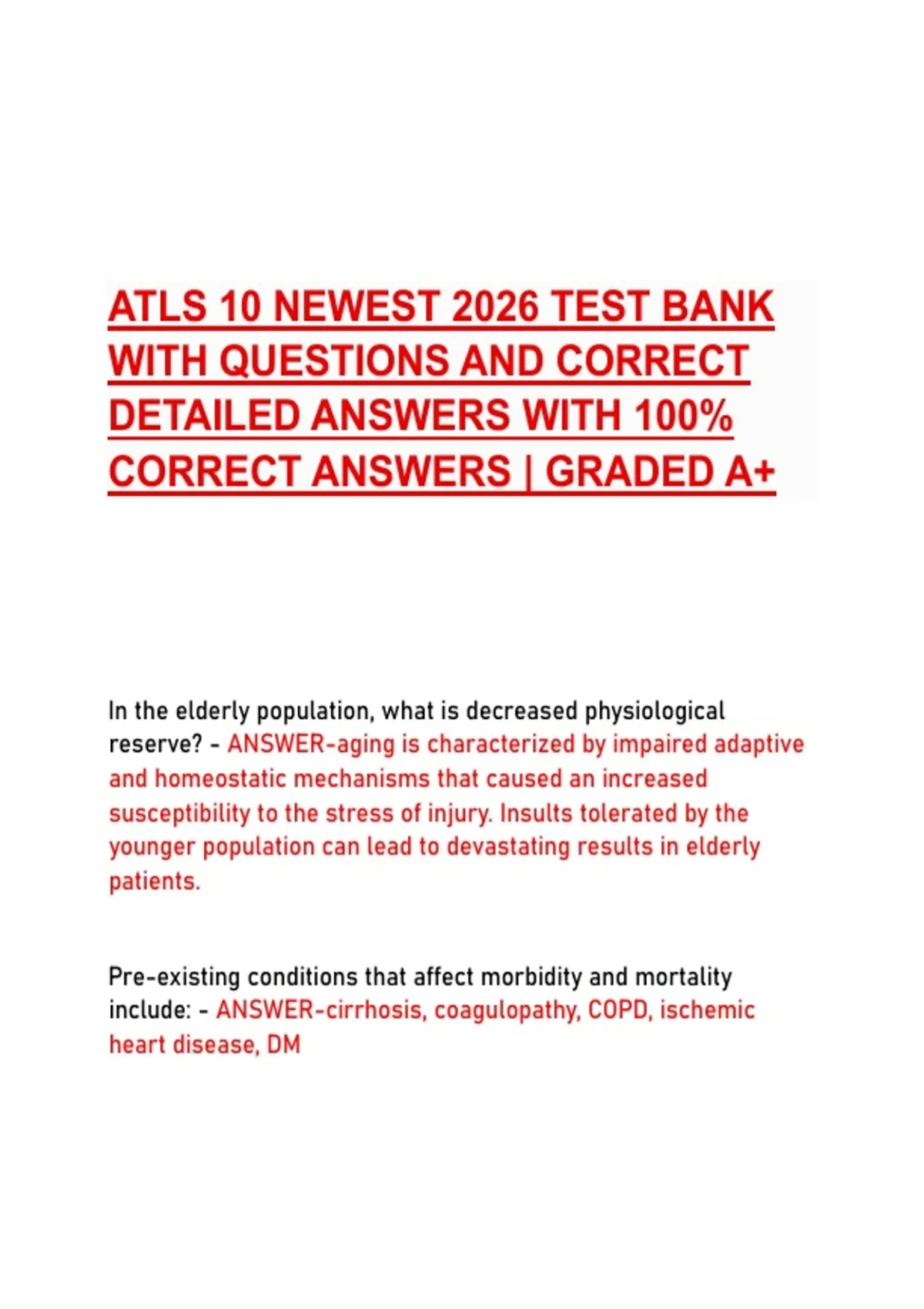 ATLS 10 NEWEST 2026 TEST BANK WITH QUESTIONS AND CORRECT DETAILED ANSWERS WITH 100% CORRECT ANSWERS | GRADED A+ In the elderly population, what is decreased physiological reserve? - ANSWER-aging is characterized by impaired adaptive and homeostatic mechanisms that caused an increased susceptibility to the stress of injury. Insults tolerated by the younger population can lead to devastating results in elderly patients. Pre-existing conditions that affect morbidity and mortality include: - ANSWER-cirrhosis, coagulopathy, COPD, ischemic heart disease, DM True or false? Although the mechanism of injury may be similar to those for the younger population, data shows increased mortality with similar severity of injury in older adults. - ANSWER-True What is the most common mechanism of injury in the elderly? - ANSWER-Fall. Nonfatal falls are common in women and fractures are common in women who fall. Falls are the most common cause of TBI. In the elderly population, what are risk factors for falls? - ANSWER-advanced age, physical impairment, history of previous fall, medication use, dementia, unsteady gait, and visual, cognitive impairment Most of elderly traffic fatalities occur in the daytime and on weekends and typically involve other vehicles. Why? - ANSWEROlder people drive on more familiar roads and at lower speeds and tend to drive during the day. Older people have slower reaction time, a larger blind spot, limited cervical mobility, decreased hearing, and cognitive impairment. True or False? Mortality associated with small to moderate sized burns in older adults remains high - ANSWER-True Spilled hot liquids on the leg, which in younger patients may reepithelialize due to an adequate number of hair follicles, will result in a full thickness burn in older patients. - ANSWER-this is true Airway-patients may have dentures that may loosen or obstruct the airway. If dentures are not obstructing the airway, leave them in place for what? - ANSWER-bag mask ventilation, as it improves mask fitting. When preforming rapid sequence intubation, the dose of benzos, barbiturates, and other sedatives should be reduced to what percentage to minimize the risk of cardiovascular depression? - ANSWER-20-40% Functional changes in cardiac system include declining function, decreased sensitivity to catecholamines, atherosclerosis of coronary vessels, increased afterload, fixed heart rate (beta blockers) - ANSWER-this results in lack of classic response to hypovolemia, risk for cardiac ischemia, elevated BP at baseline, and increased risk of dysrythmias. Functional changes in pulmonary system include decreased elastic recoil, reduced residual capacity, decreased gas exchange and decreased cough reflex - ANSWER-thus they are at increased risk for respiratory failure, increased risk for pneumonia, and poor tolerance to rib fractures Functional changes in renal system include loss of renal mass, decreased GFR, and decreased sensitivity to ADH and aldosterone - ANSWER-resulting in drug dosing for renal insufficiency, decreased ability to concentrate urine, increased risk for AKI and urine flow may be normal with hypovolemia Functional changes to MSK include loss of lean body mass, osteoporosis, changes in joints and cartilage, c spine degenerative changes and loss of skin elastin and subcutaneous fat - ANSWER-resulting in increased risk for fractures, decreased mobility, difficulty for oral intubation, risk of skin injury, increased risk for hypothermia, challenges in rehabiliation Functional changes in Endocrine system include decreased production and response to thyroxin and decreased dehydroepiandrosterone (DHEA) - ANSWER-resulting in occult hypothyroidism, relative hypercortisone states and increased risk of infection True or false: Arthritis can complicate the airway and cervical spine. Patients can have multilevel degenerative changes affecting disk spaces and posterior elements associated with severe central canal stenosis, cord compression, and myelomalacia - ANSWER-true In elderly population, due to their changes in pulmonary system, placing a gauze between gums and cheek to achieve seal when using bag valve mask ventilation is okay. In addition, because aging causes a suppressed heart rate response to hypoxia...... - ANSWER-respiratory failure may present insidiously in older adults. Age related changes in the cardiovascular system place the elderly trauma patient at significant risk for being inaccurately categorized as hemodynamically stable. - ANSWER-Elderly patients have a fixed heart rate and fixed cardiac output, thus, their response to hypovolemia will involve increasing their systemic vascular resistance. Furthermore, since older patients have HTN, an acceptable BP may truly reflect a hypotensive state. A systolic BP of 110 is to be utilized as the threshold for identifying hypotension in patients 65 and older. Do no equate blood pressure with shock in older patients - ANSWER-BP in older patients may look normal due to the medications they are on. Use lactate and base deficit to evaluate for evidence of shock what 2 factors place elderly patients at risk for intracranial hemorrhage? - ANSWER-aging causes dura to become more adherent to the skull increasing risk of injury and older patients are on anticoagulant and antiplatelet medications. Loss of subcutaneous fat, nutritional deficiencies, chronic medical conditions place elderly patients as risk for hypothermia and complications for immobility. - ANSWER-Rapid evaluation and