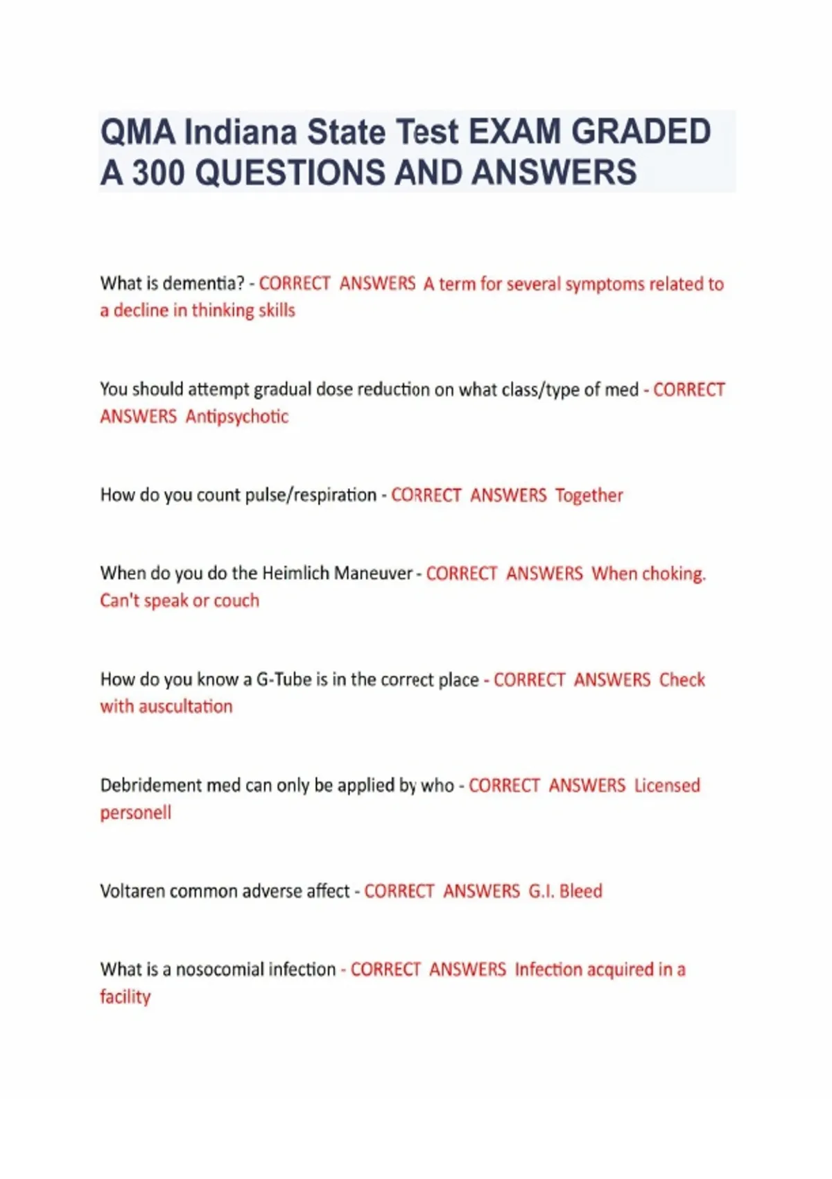 QMA Indiana State Test EXAM GRADED A 300 QUESTIONS AND ANSWERS What is dementia? - CORRECT ANSWERS A term for several symptoms related to a decline in thinking skills You should attempt gradual dose reduction on what class/type of med - CORRECT ANSWERS Antipsychotic How do you count pulse/respiration - CORRECT ANSWERS Together When do you do the Heimlich Maneuver - CORRECT ANSWERS When choking. Can't spea