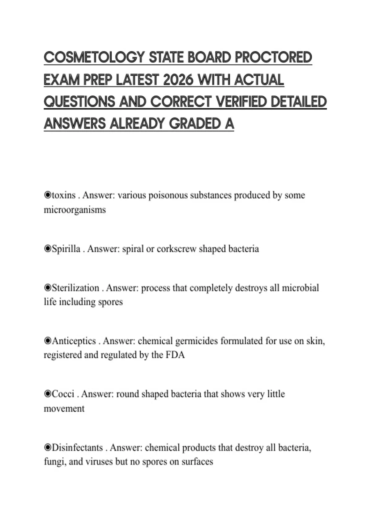 COSMETOLOGY STATE BOARD PROCTORED EXAM PREP LATEST 2026 WITH ACTUAL QUESTIONS AND CORRECT VERIFIED DETAILED ANSWERS ALREADY GRADED A
