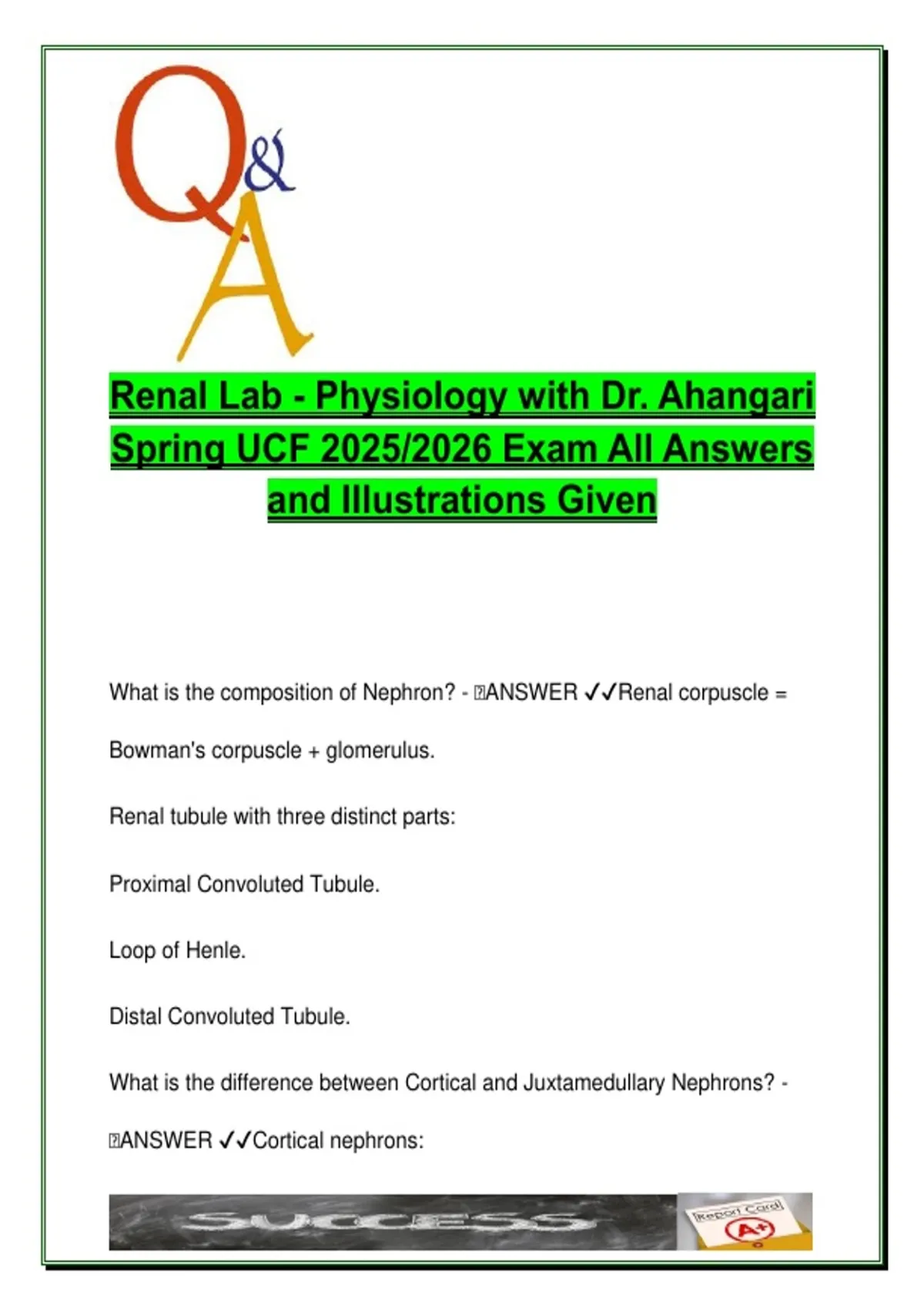 This document is a complete and structured renal physiology lab review for Physiology with Dr. Ahangari at the University of Central Florida (Spring 2025/2026). It contains over 60 expert-verified exam questions and answers, covering detailed anatomical and functional concepts essential to mastering renal physiology. The document is organized in a Q&A format with illustrations and clearly labeled answers, ideal for exam preparation. Key topics include the composition of the nephron, distinctions between cortical and juxtamedullary nephrons, mechanisms of urine production (filtration, reabsorption, secretion, excretion), renal blood flow, and tubular functions (PCT, Loop of Henle, DCT, and collecting duct). It further covers glomerular filtration, renal and water clearance, and hormonal regulation via ADH and the Renin-Angiotensin-Aldosterone System (RAAS). Clinical applications such as urinary tract infections (UTIs), micturition reflex, and renal calculi (kidney stones) are also included, along with treatment concepts like lithotripsy. This resource is ideal for physiology students preparing for lab practicals, unit exams, or comprehensive finals, particularly within pre-medical, nursing, or biomedical science programs. Best suited for students in: – Human Physiology and Anatomy – Pre-Med and Nursing Programs – Biomedical Sciences – Health Sciences and Clinical Medicine – UCF Physiology Lab Courses Keywords: renal physiology, nephron structure, glomerular filtration, urine formation, PCT, DCT, Loop of Henle, collecting duct, renal clearance, water clearance, aldosterone, ADH, RAAS, micturition, kidney stones, lithotripsy, UTI, renal blood flow, University of Central Florida
