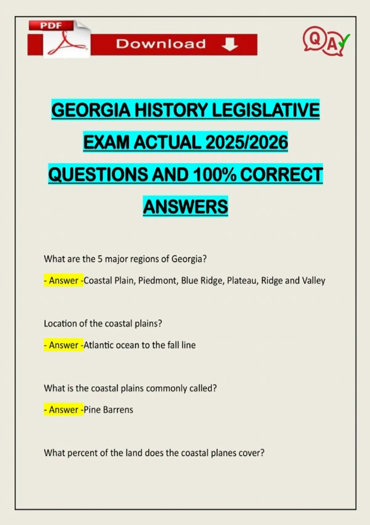 GEORGIA HISTORY LEGISLATIVE EXAM ACTUAL 2025/2026 QUESTIONS AND 100% CORRECT ANSWERS What are the 5 major regions of Georgia? - Answer -Coastal Plain, Piedmont, Blue Ridge, Plateau, Ridge and Valley Location of the coastal plains? - Answer -Atlantic ocean to the fall line What is the coastal plains commonly called? - Answer -Pi
