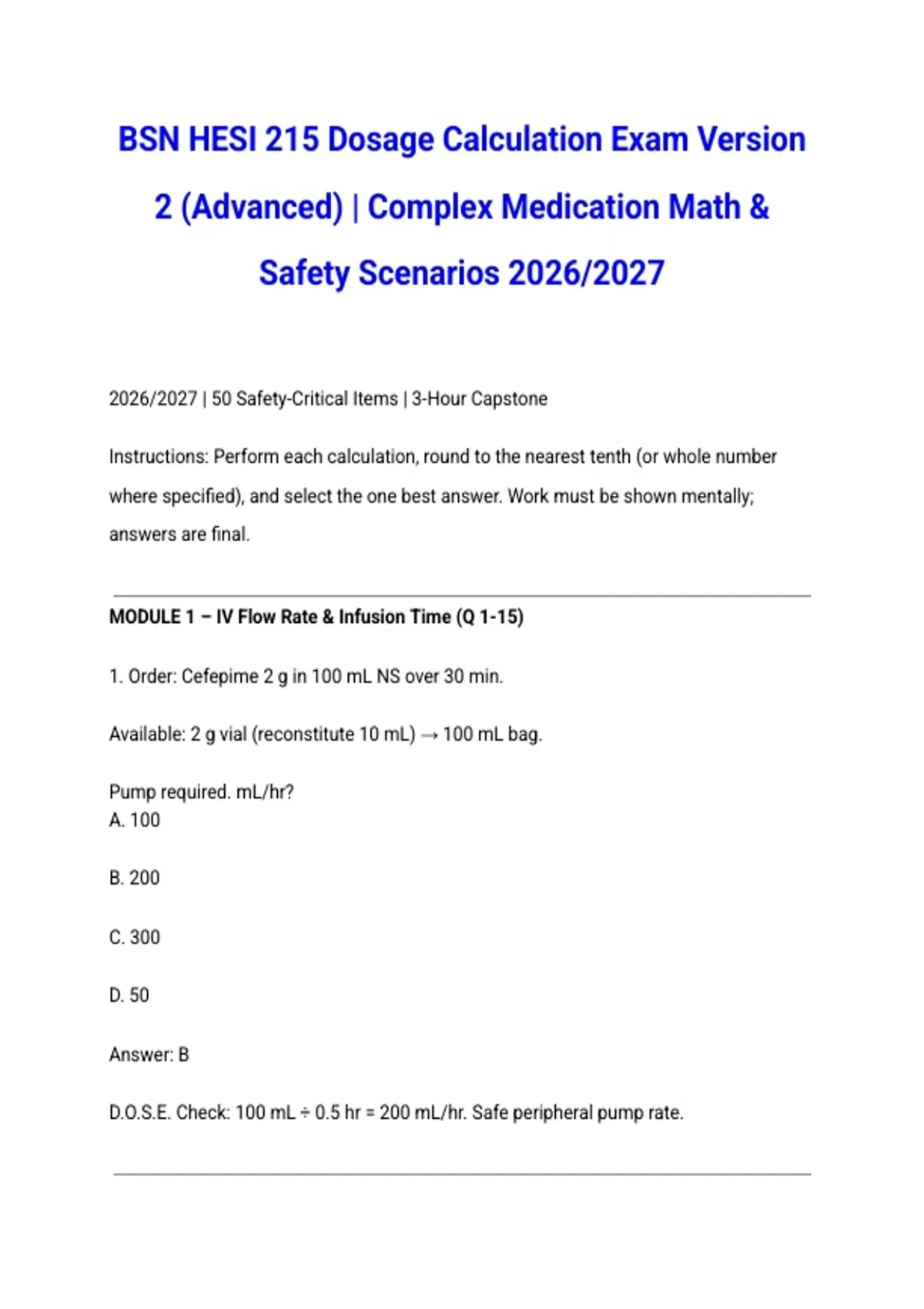 BSN HESI 215 Dosage Calculation Exam Version 2 (Advanced) | Complex Medication Math & Safety Scenarios 2026/2027