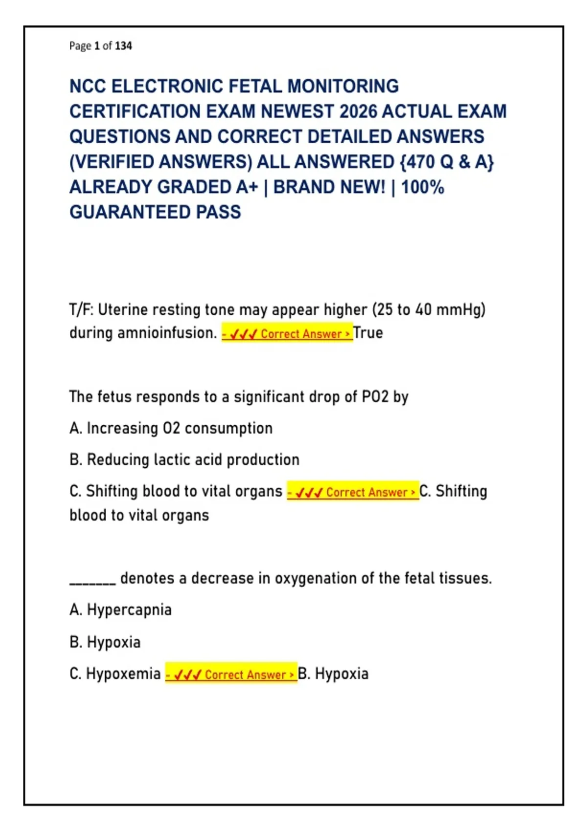 NCC ELECTRONIC FETAL MONITORING CERTIFICATION EXAM NEWEST 2026 ACTUAL EXAM QUESTIONS AND CORRECT DETAILED ANSWERS (VERIFIED ANSWERS) ALL ANSWERED {470 Q & A} ALREADY GRADED A+ | BRAND NEW! | 100% GUARANTEED PASS